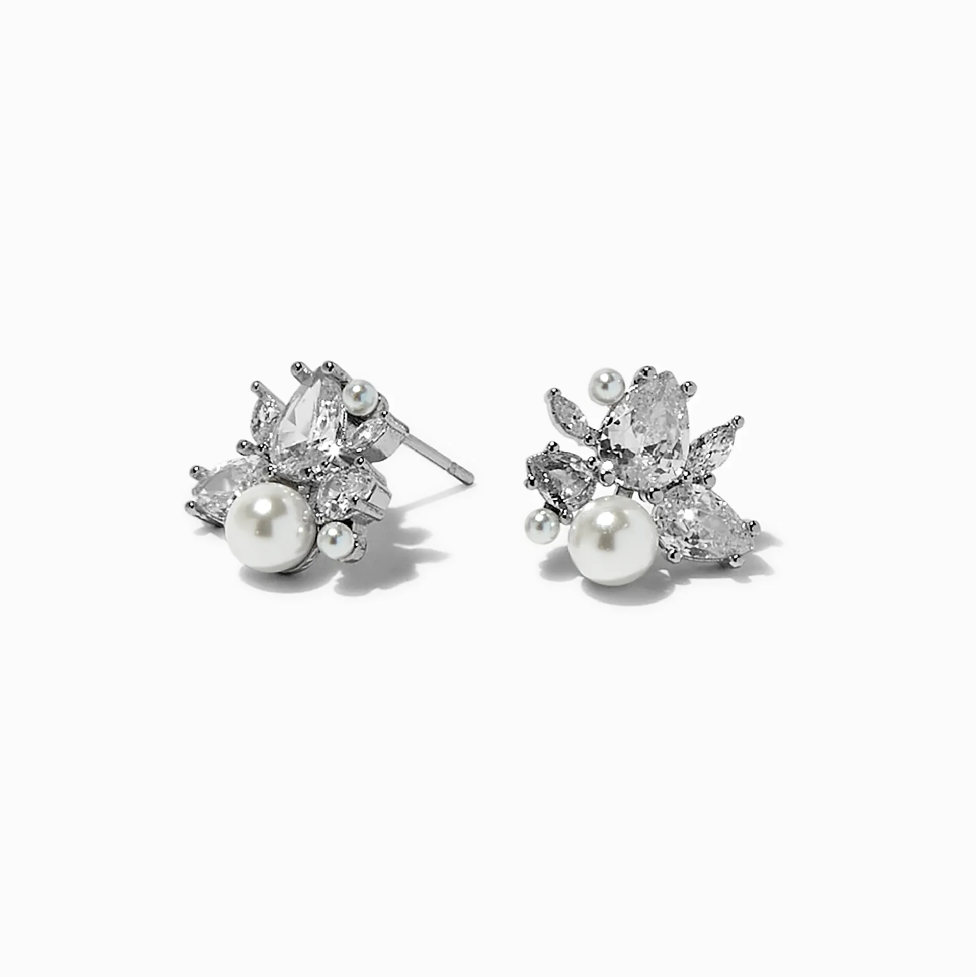 Decorate your ear party with sparkles with these silver-tone stud earrings. The cluster design is covered in a faux pearl and real cubic zirconias that combine forces for maximum impact.
