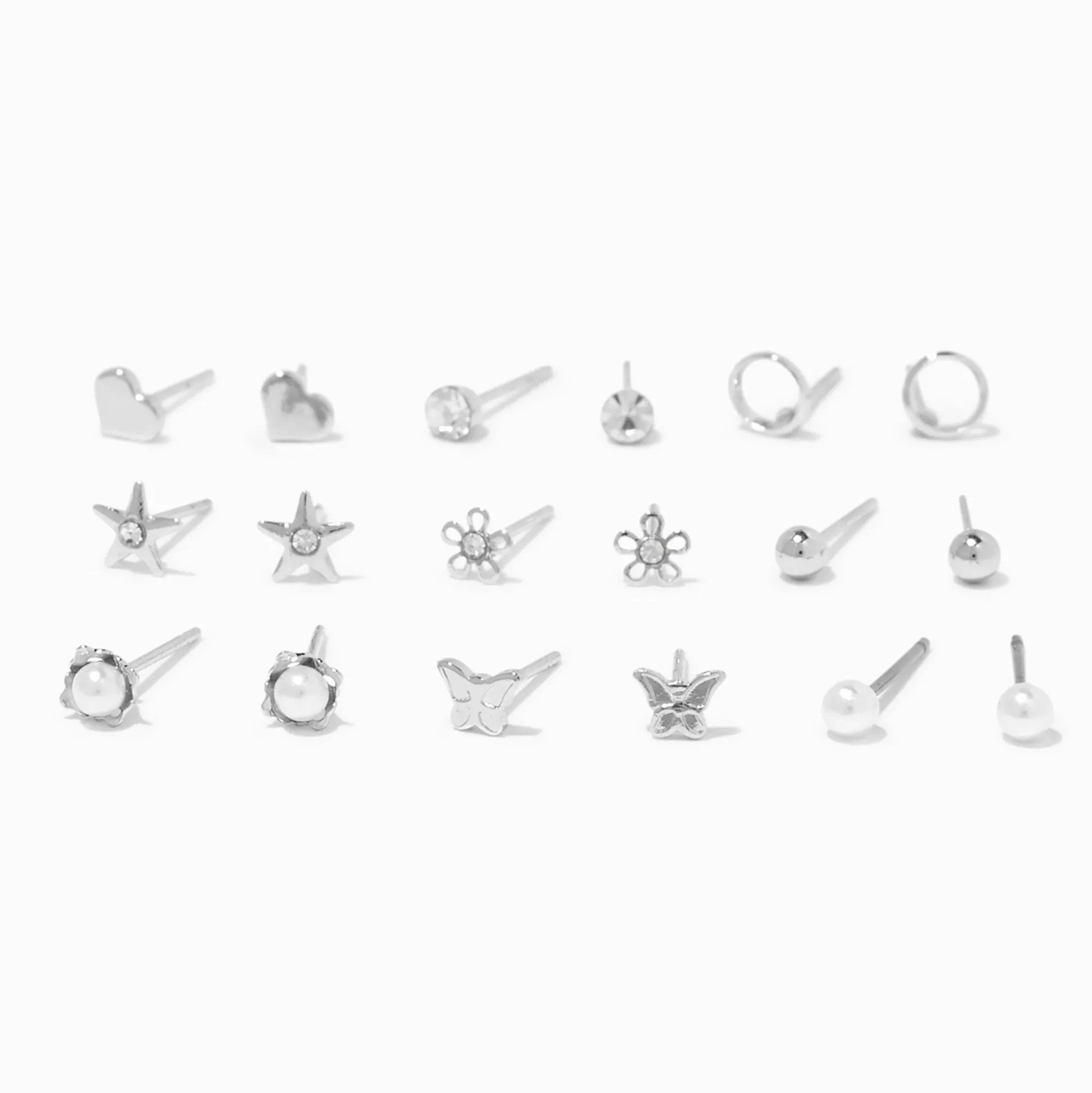 Always have the perfect pair with this expansive earring set. Options include hearts, faux crystals, circles, stars, flowers, balls, faux pearls, and butterflies.