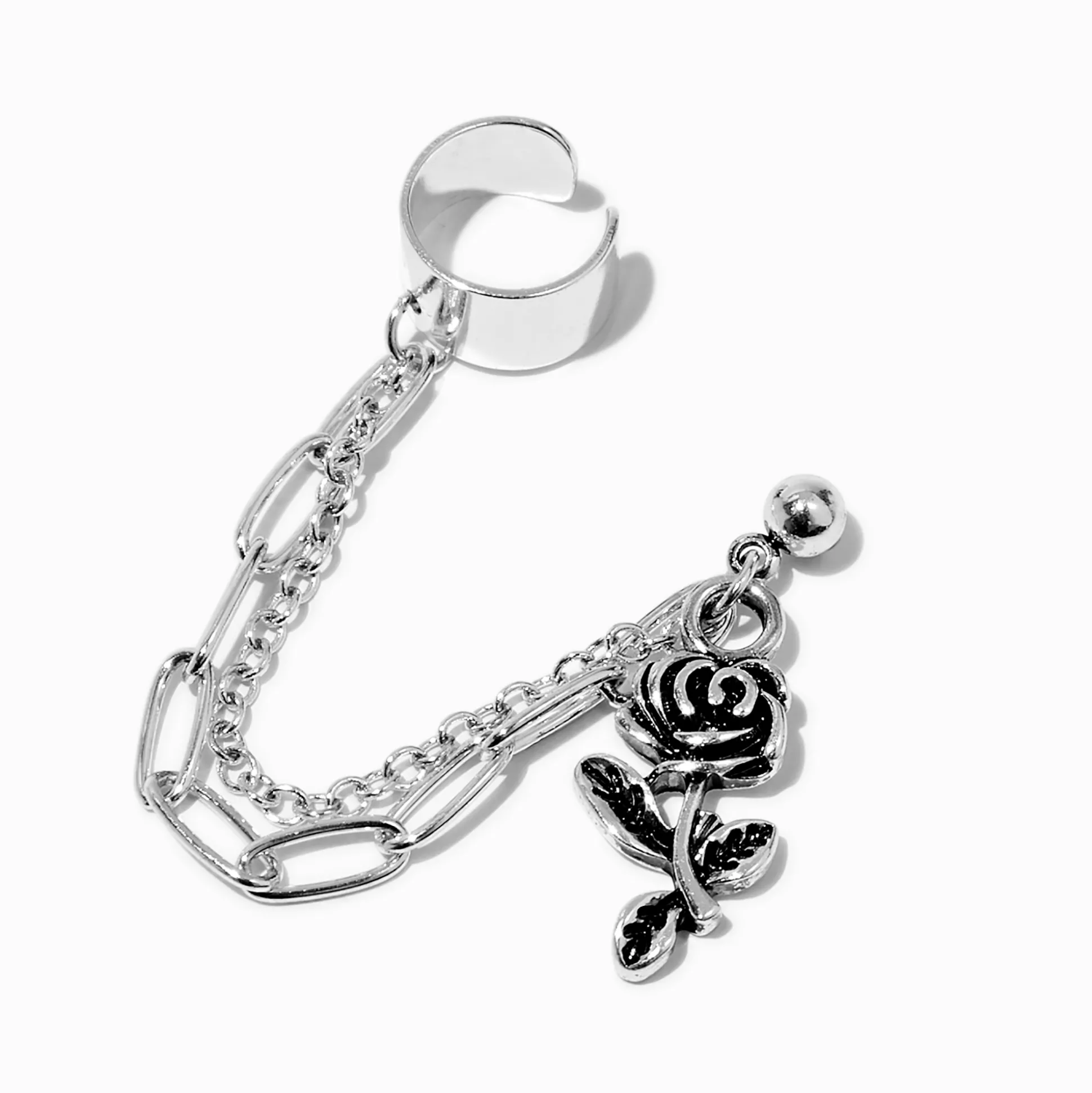 Switch up your jewelry look with this set of ear connector earrings! Complete with dangly burnished rose design, The post-back earring is connected to a ear cuff.