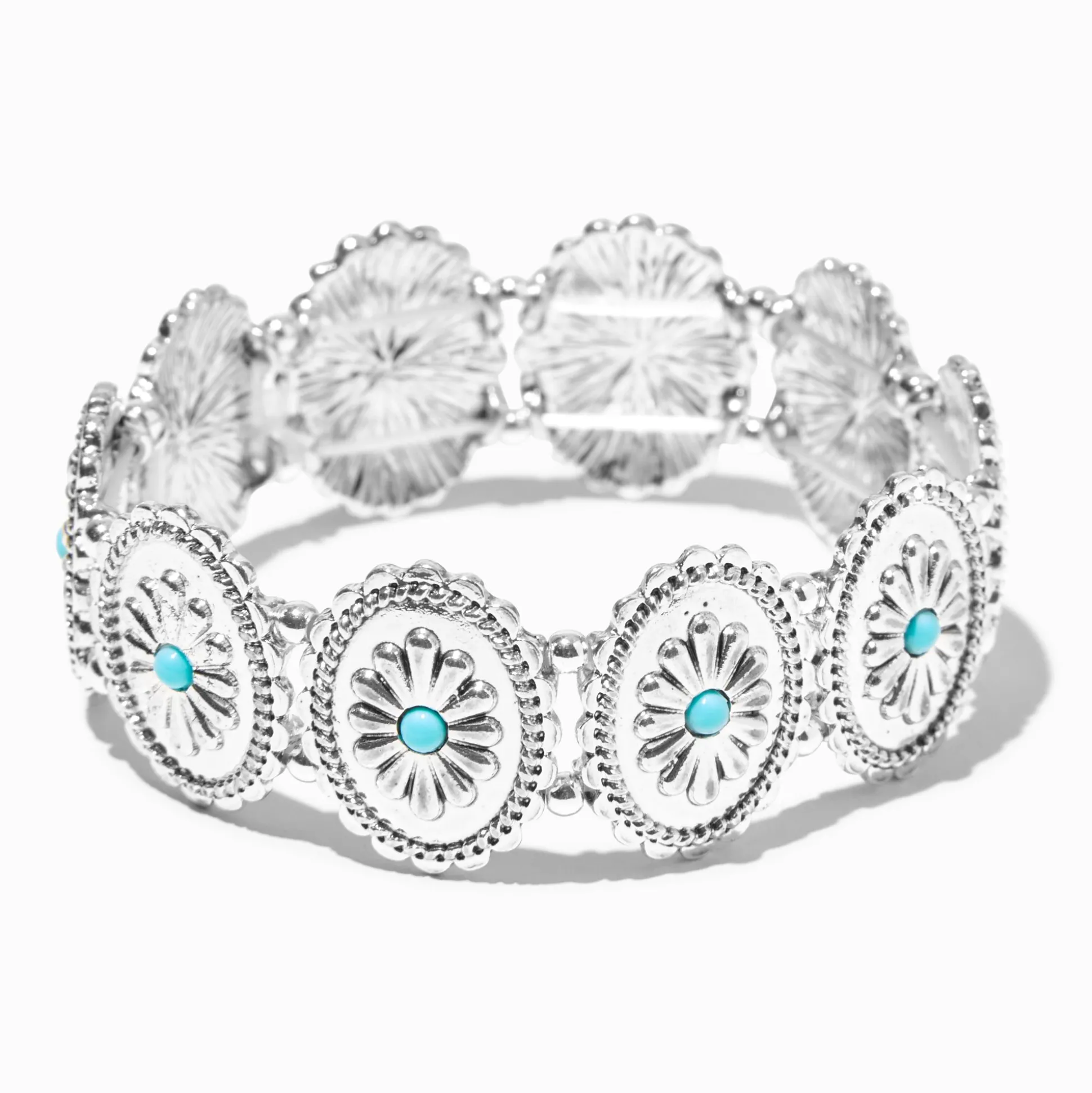 Decorate your wrist with this silver-tone stretch bracelet. It has a faux turquoise details on round filigree-decorated flower medallions.