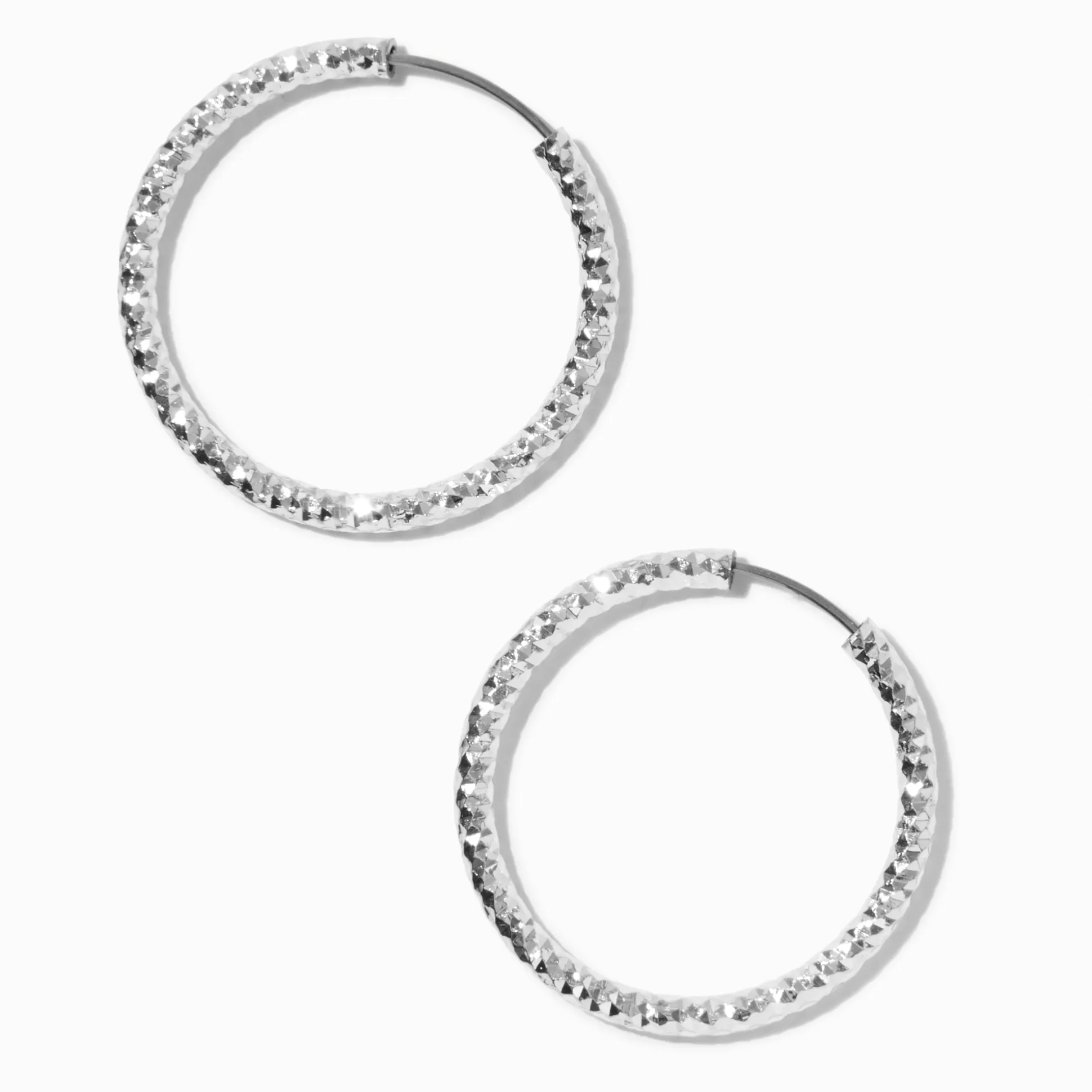 Switch up the basic hoop trend with this pair of earrings! Silver-tone hoop earrings feature a sandblasted finish that makes these super cool.