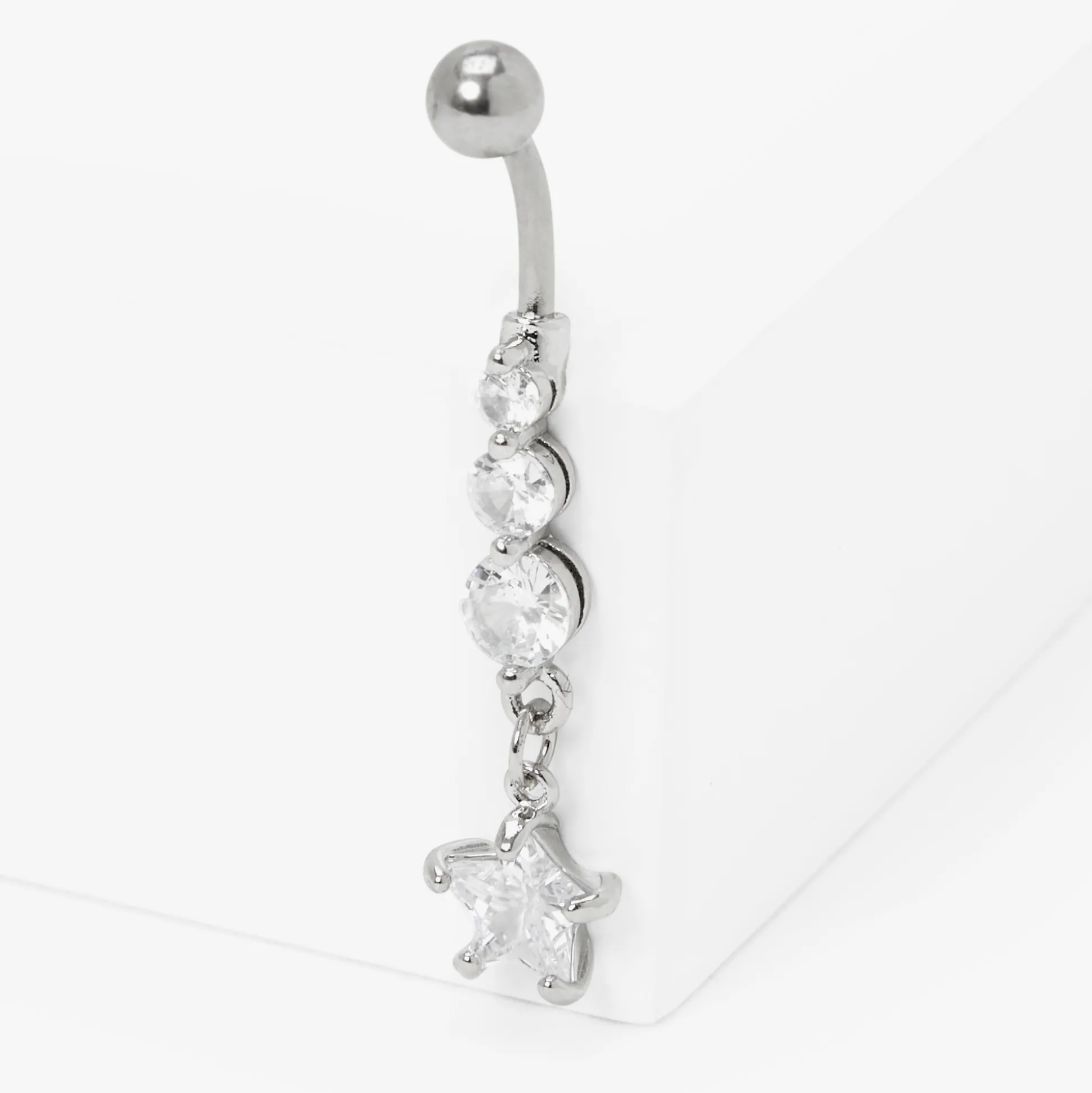 Body jewelry made for a star studded summer! This sparkly belly ring features a star shaped faux crystal charm dangling from three round faux crystals in a linear design.