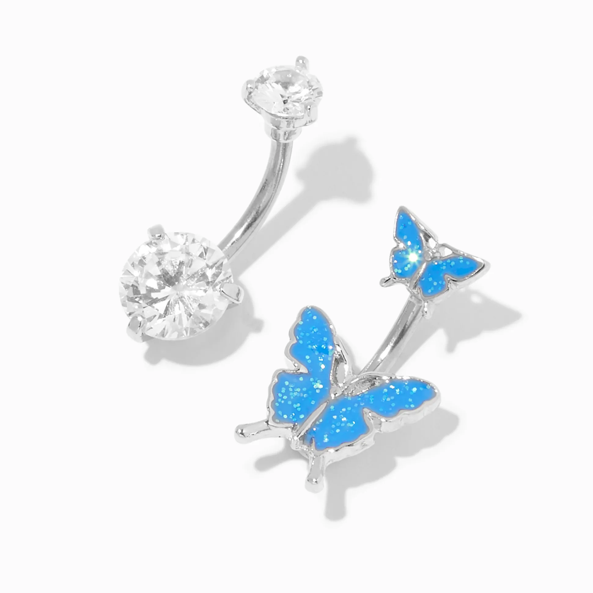 Give yourself options with this two-pack belly rings. The silver-tone twosome have sparkly cubic zirconias on one and glittery enamel blue butterflies on the other.