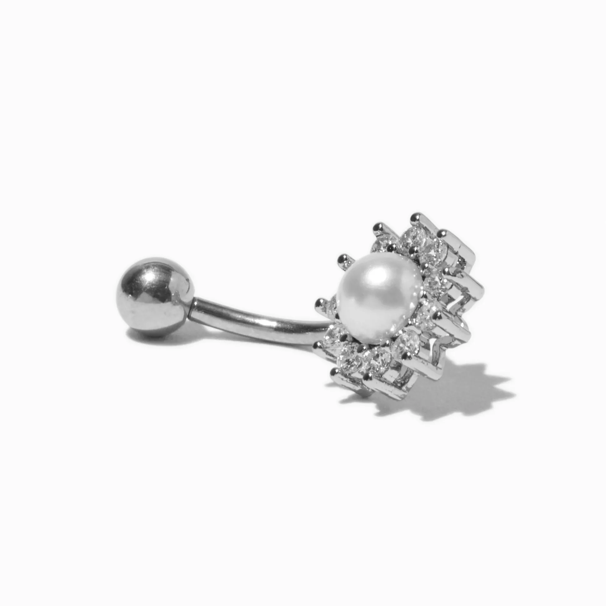 Create a look inspired by flowers with this belly bar. The silver-tone design is made from durable stainless steel and has a faux pearl that’s surrounded by cubic zirconias, creating a floral design.