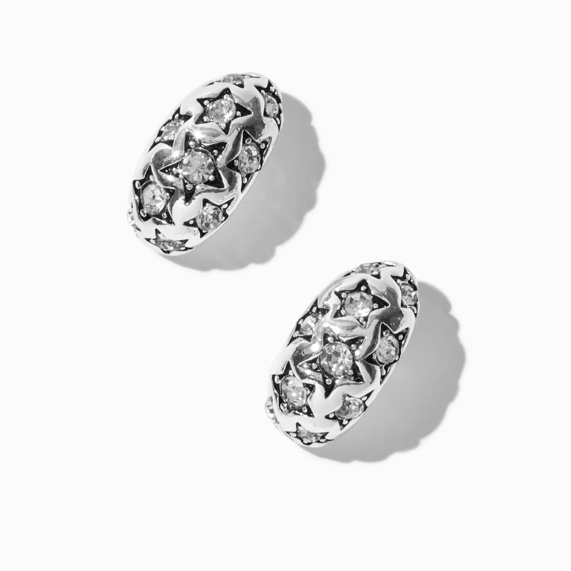 Show off your mega stardom in these starry studs. The silver-tone designs have star prints that are accented with faux crystals.