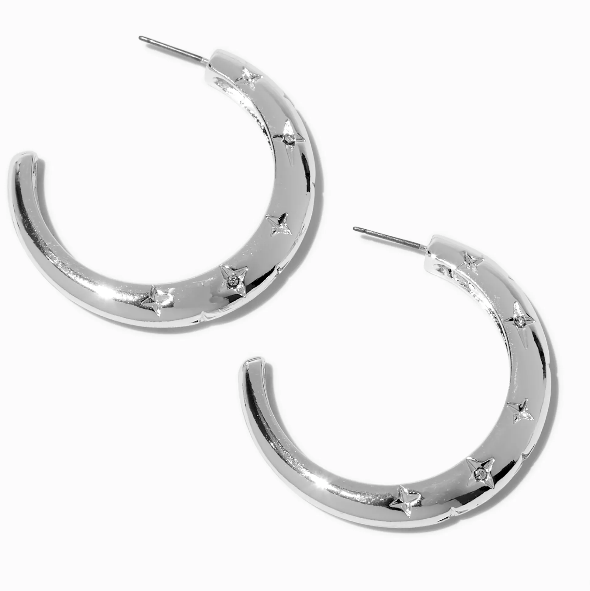 Classic hoops will always be in style! Simple yet elegant, these silver-tone hoops feature delightful stamped stars.