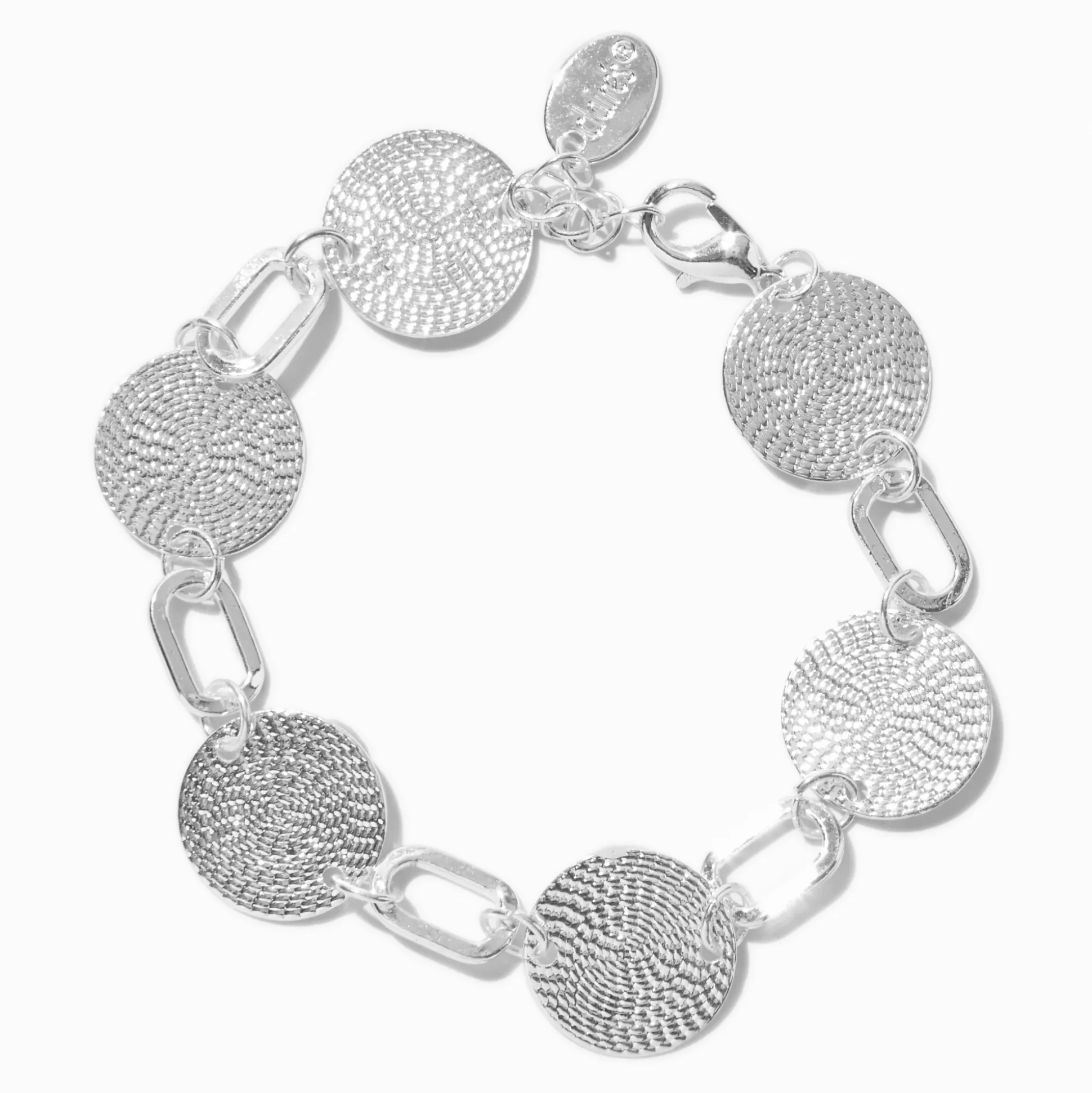 Show a lot of style with this chain link bracelet. The silver-tone design has textured disc charms for added interest.
