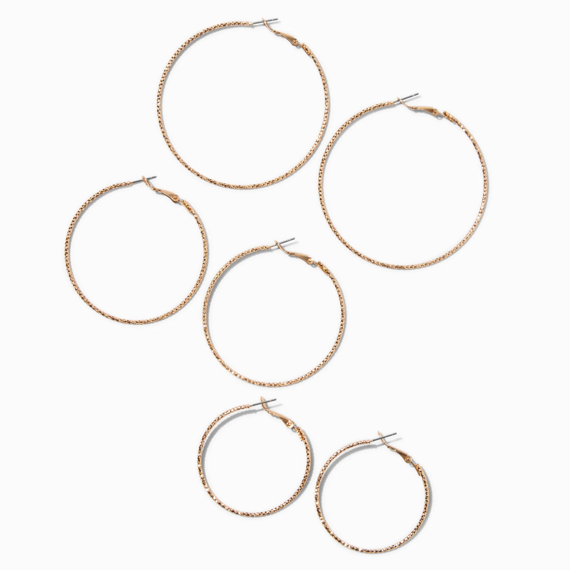 Hoops are stylish, elegant, and versatile! This set includes three pairs of textured silver-tone hoops in three sizes.