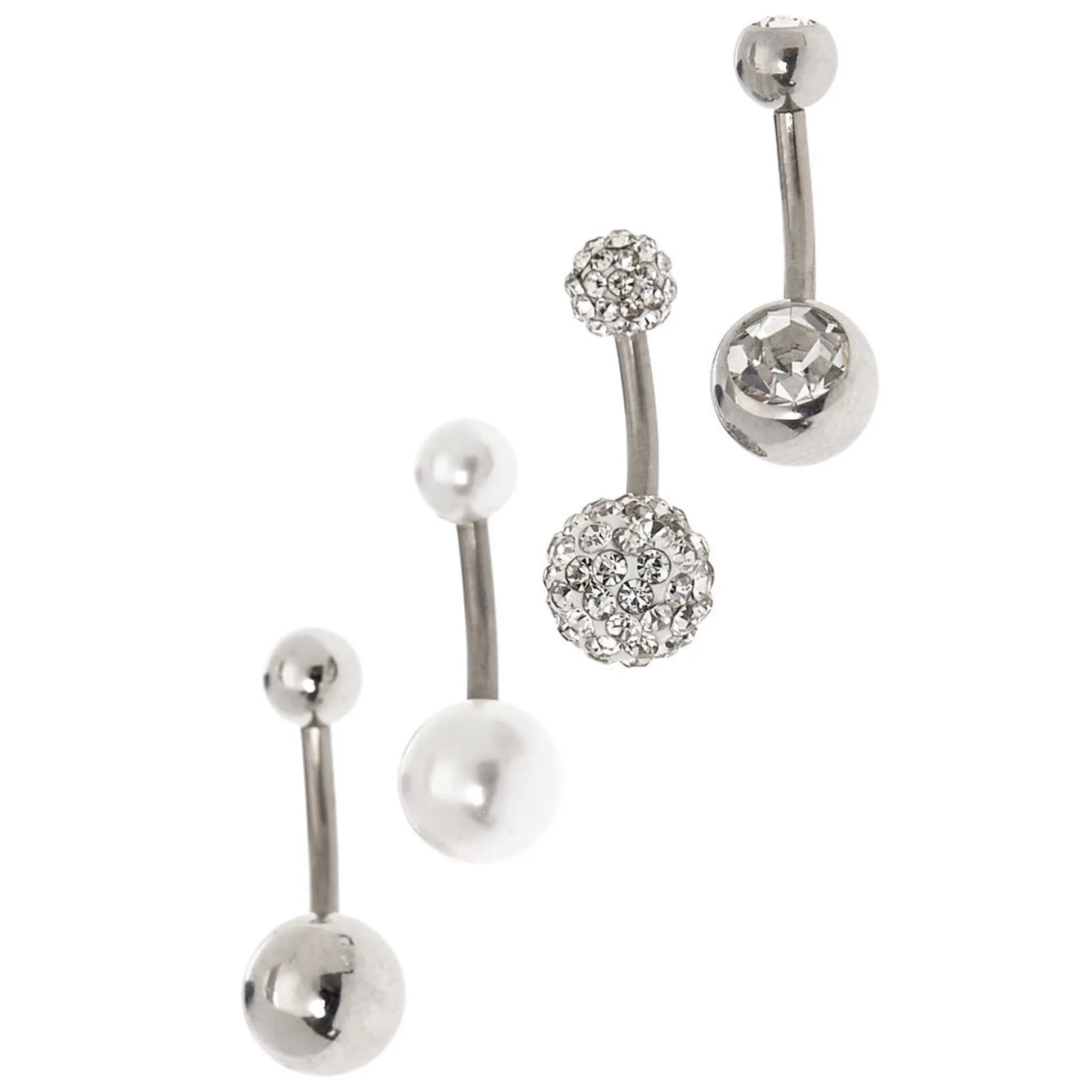 Complete your summer look with a set of everyday sparkly belly rings! This pack features four classic belly rings accented with faux crystals and pearls.