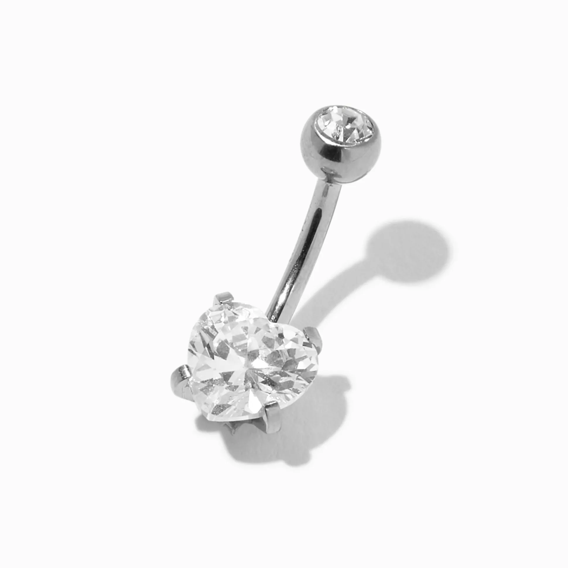 Spread some love to your belly with this flashy belly bar. The silver titanium bar has a crystal heart-shaped stone on the bottom and a bezel-set faux crystal top.
