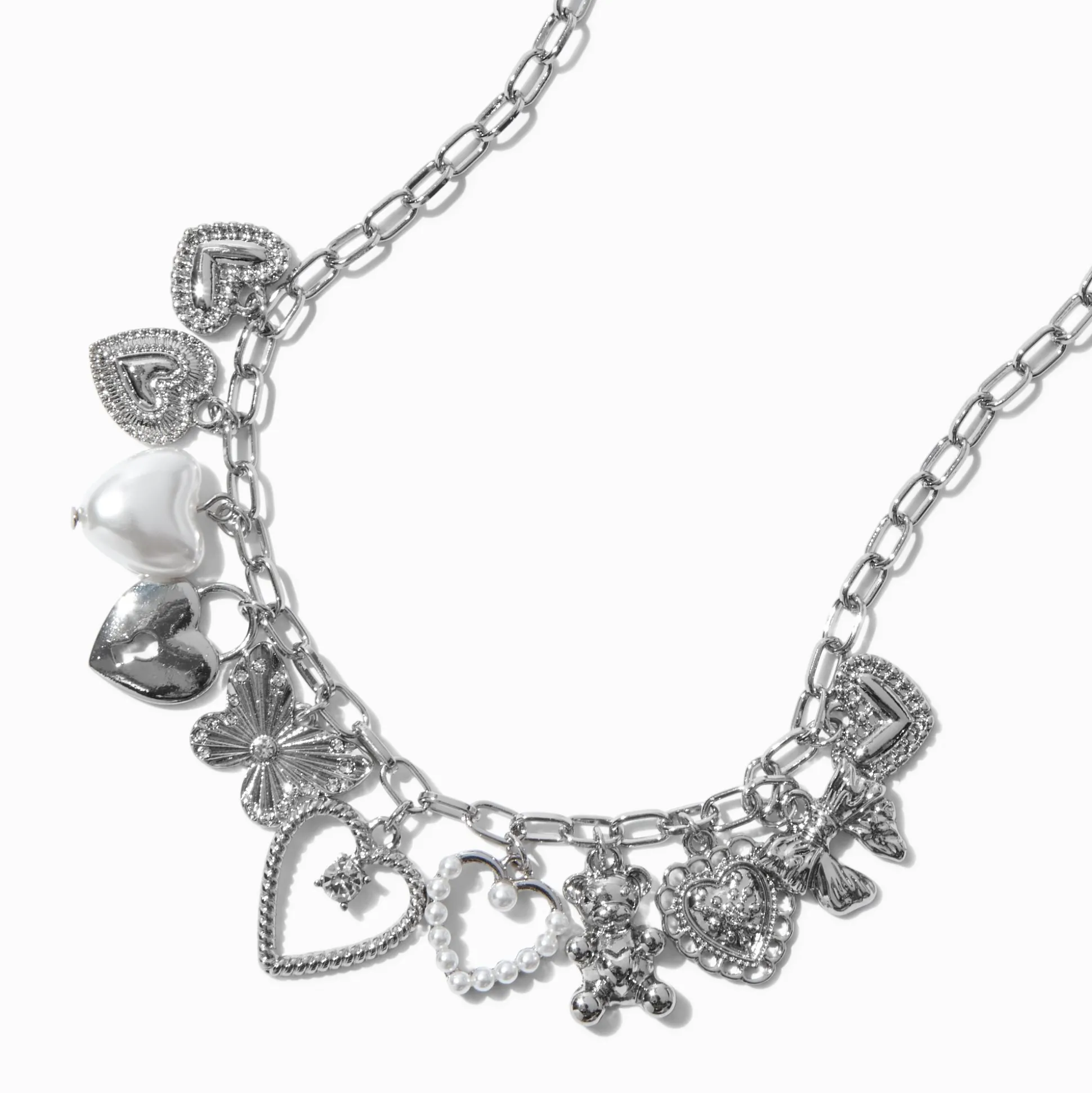 Show off your charming side with this necklace. The silver-tone paperclip chain design includes embellished hearts, bows, and more charms in silver-tone and faux pearl.