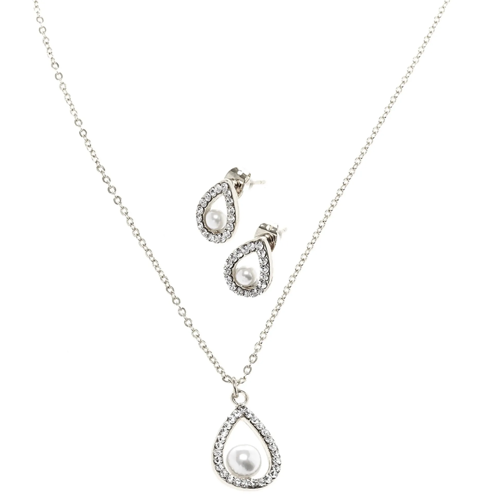 This silver-tone jewelry set is perfect for adding a simple and classic touch to your outfit. A small white faux pearl sits inside an silver-tone teardrop lined with crystals. The pendant necklace accompanies a matching pair of earrings.