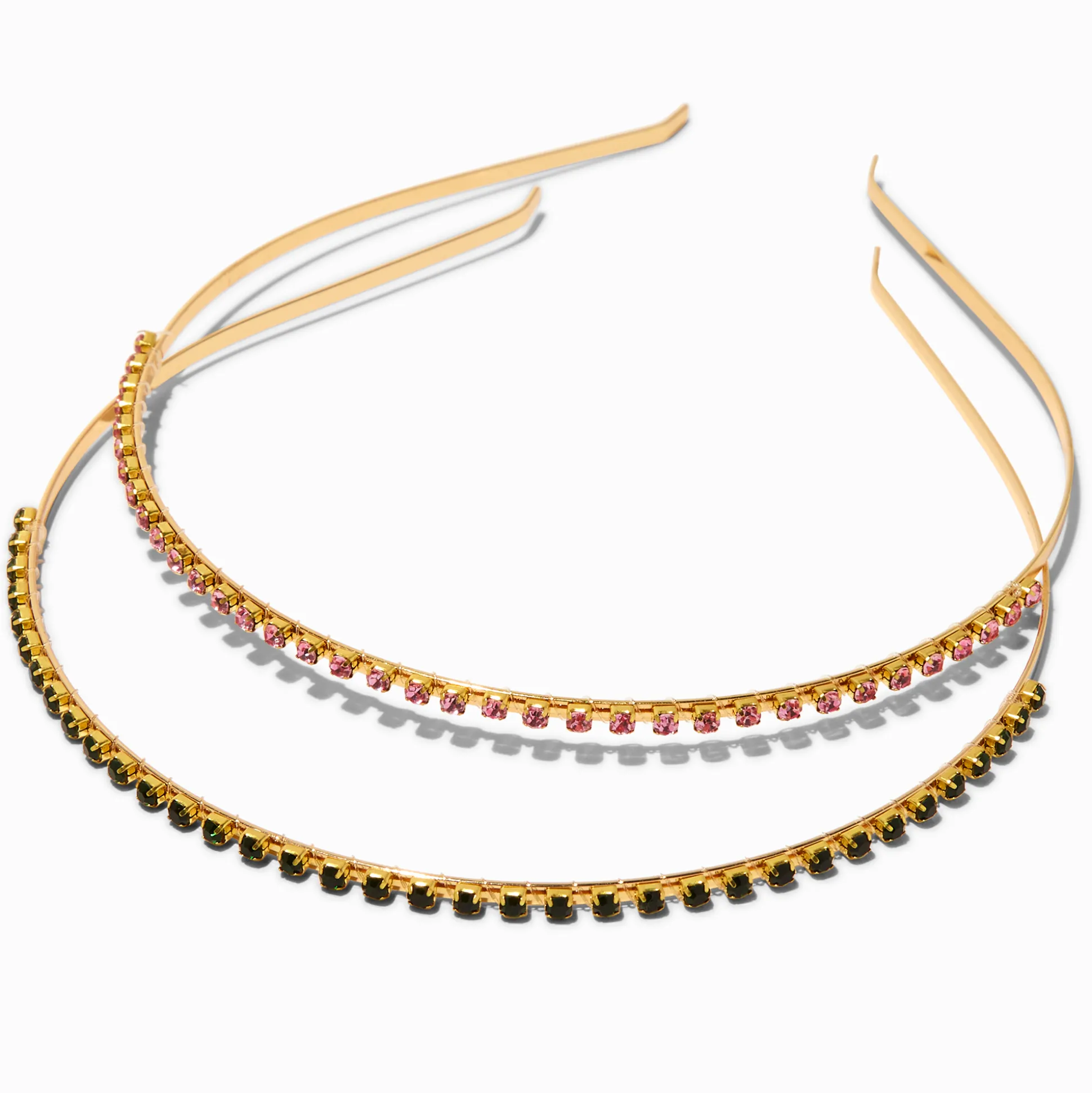 Add sparkle to your hair with these rhinestone headbands. The two-pack set includes skinny gold-tone bands with pink rhinestones and green rhinestones.