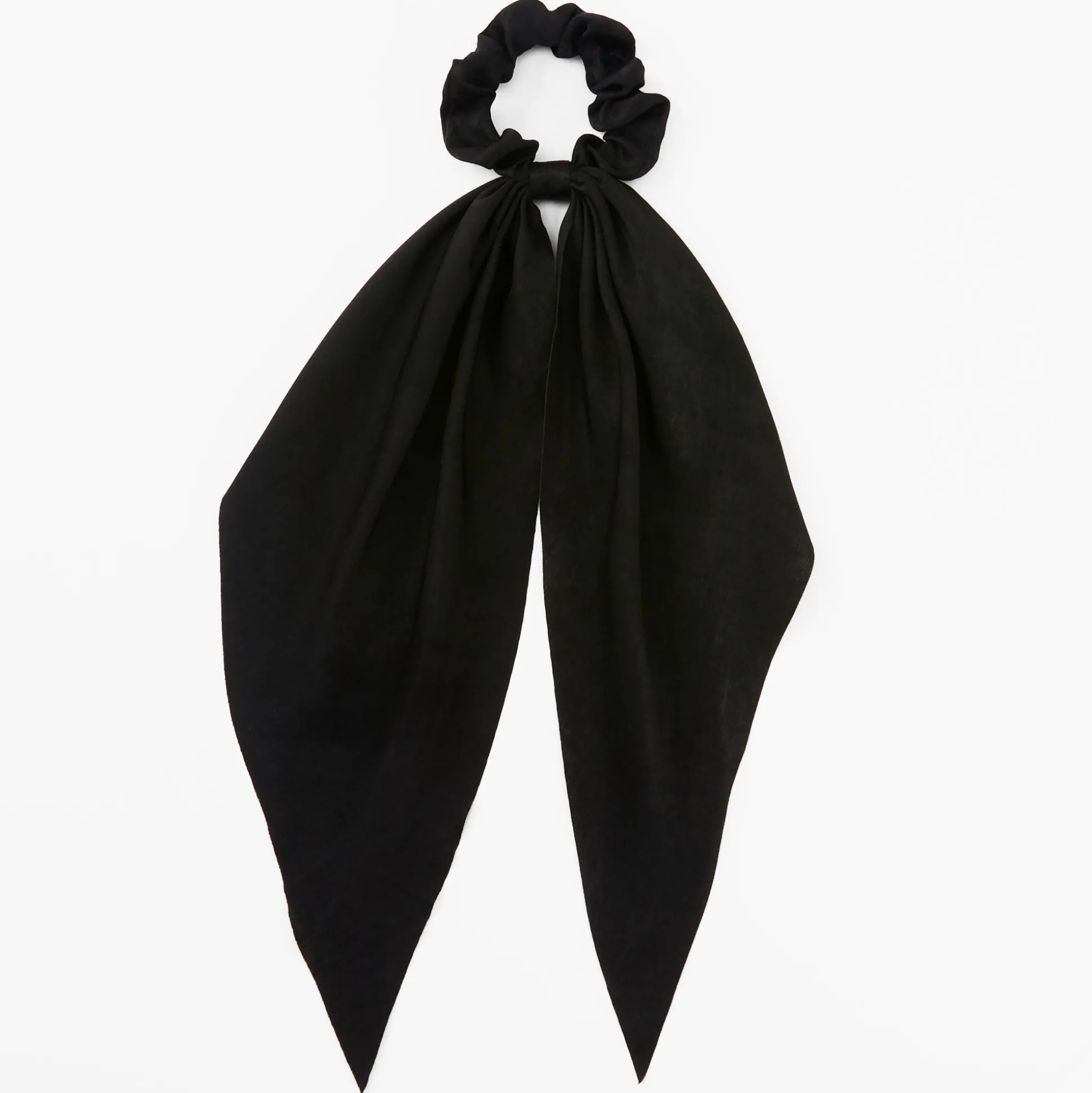Drape your ponytail in classic black! Get the look of long scarf ribbon attached to a pretty hair scrunchie. Perfect for adding an extra flair to any outfit.