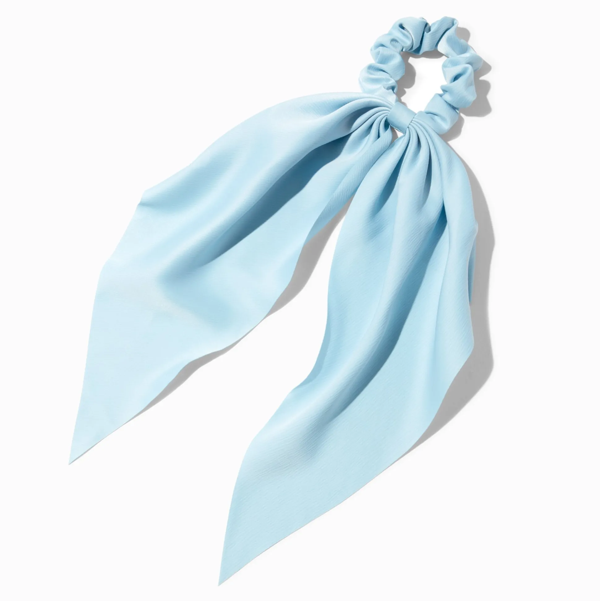 Get the look of long scarf ribbon attached to a pretty hair scrunchie. Perfect for adding an extra flair to any outfit.