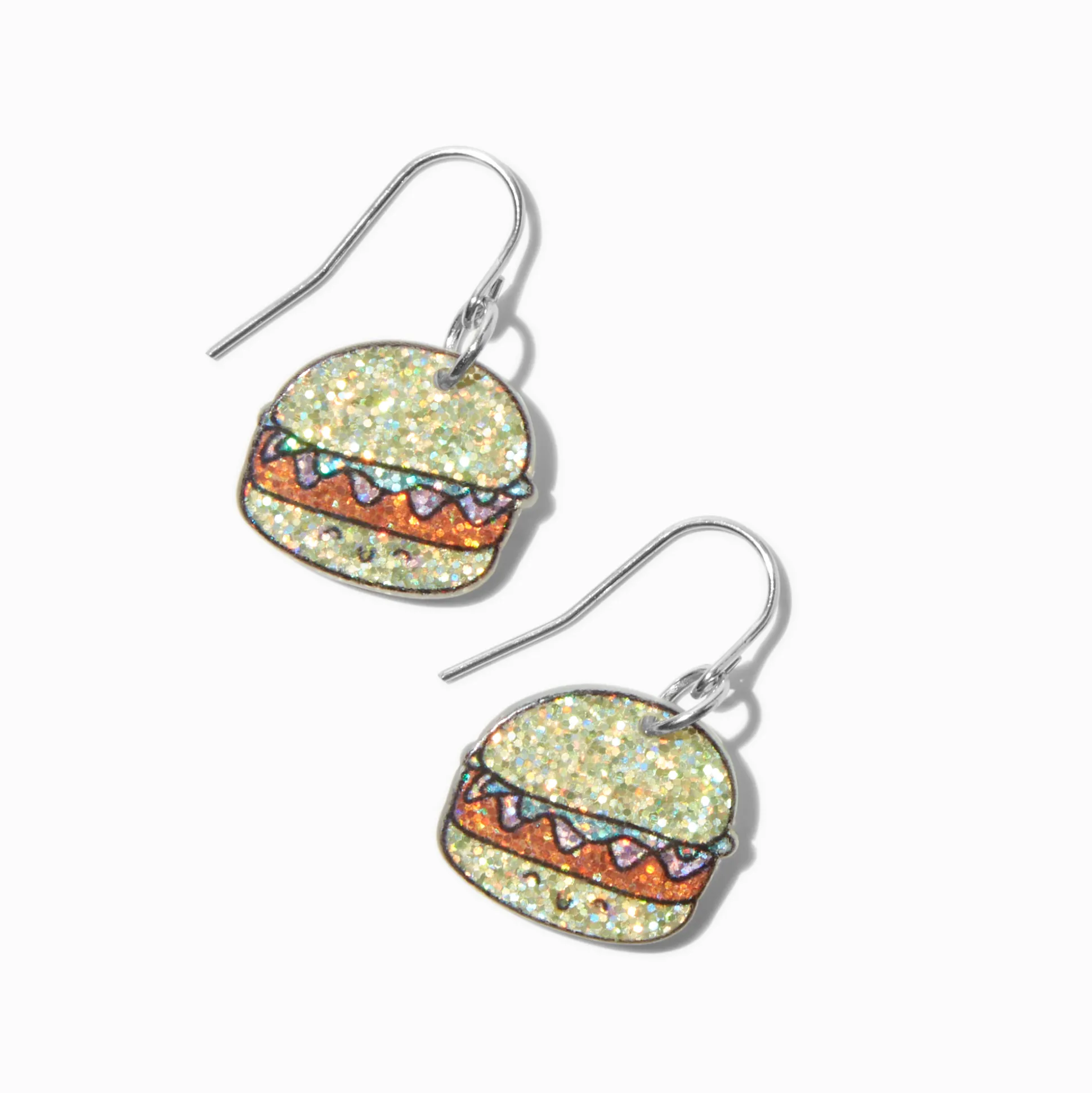You are what you eat when you’re wearing these earrings and eating a hamburger. These drop earrings have sparkle hamburger designs.