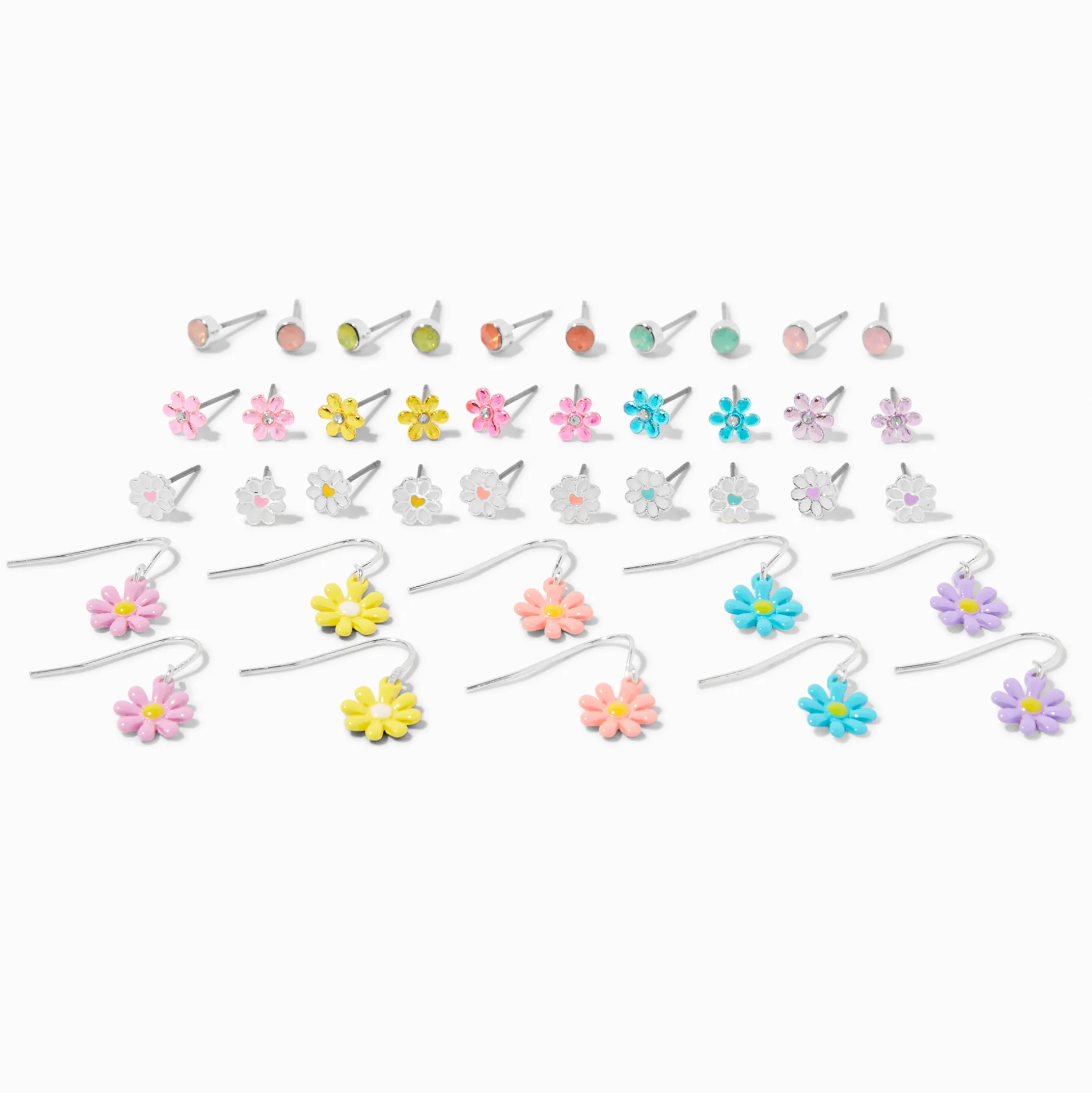 Pick the perfect pair of spring flowers with this expansive 20 pair set. The silver-tone earrings includes studs and drops in a variety of your favorite colors. Don’t feel like flowers? This set also comes with ball studs in coordinating colors to wear instead or in your other ear piercings.