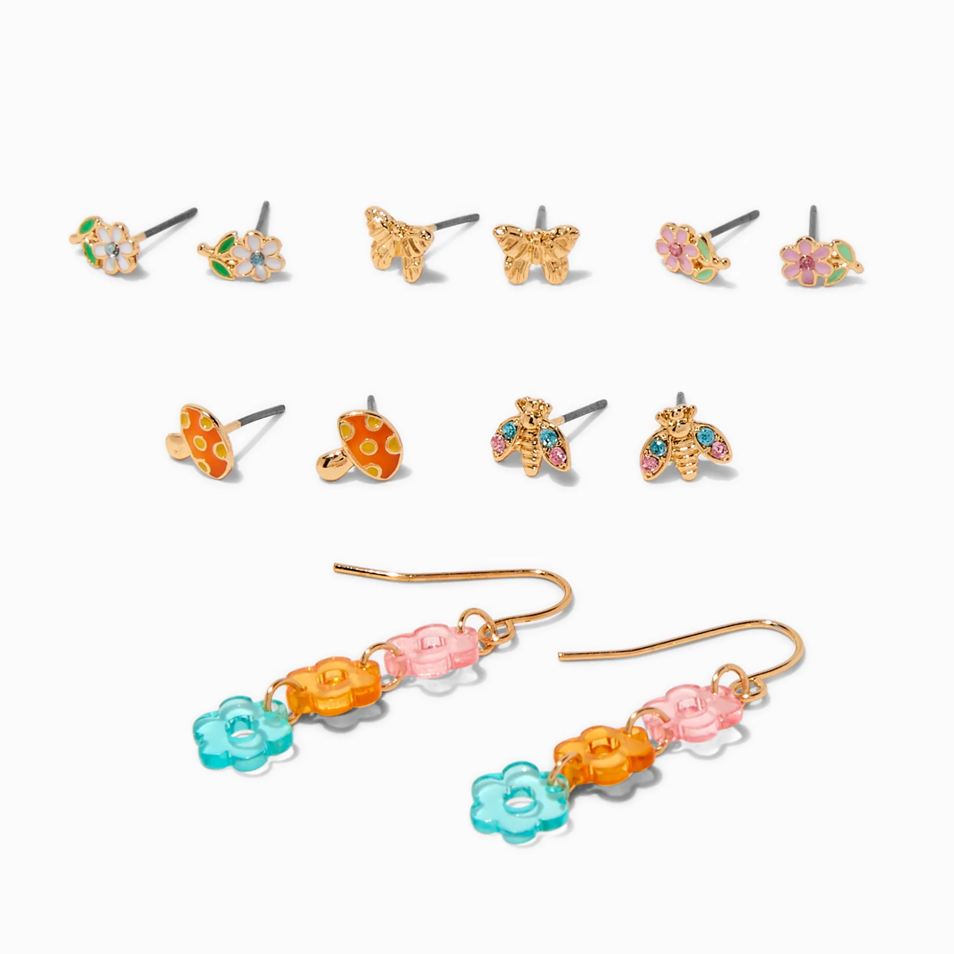 Spring has sprung when you wear any of the six pairs in this earrings set! Options include flowers, butterflies, mushrooms, and bees studs and linear daisy drop earrings.