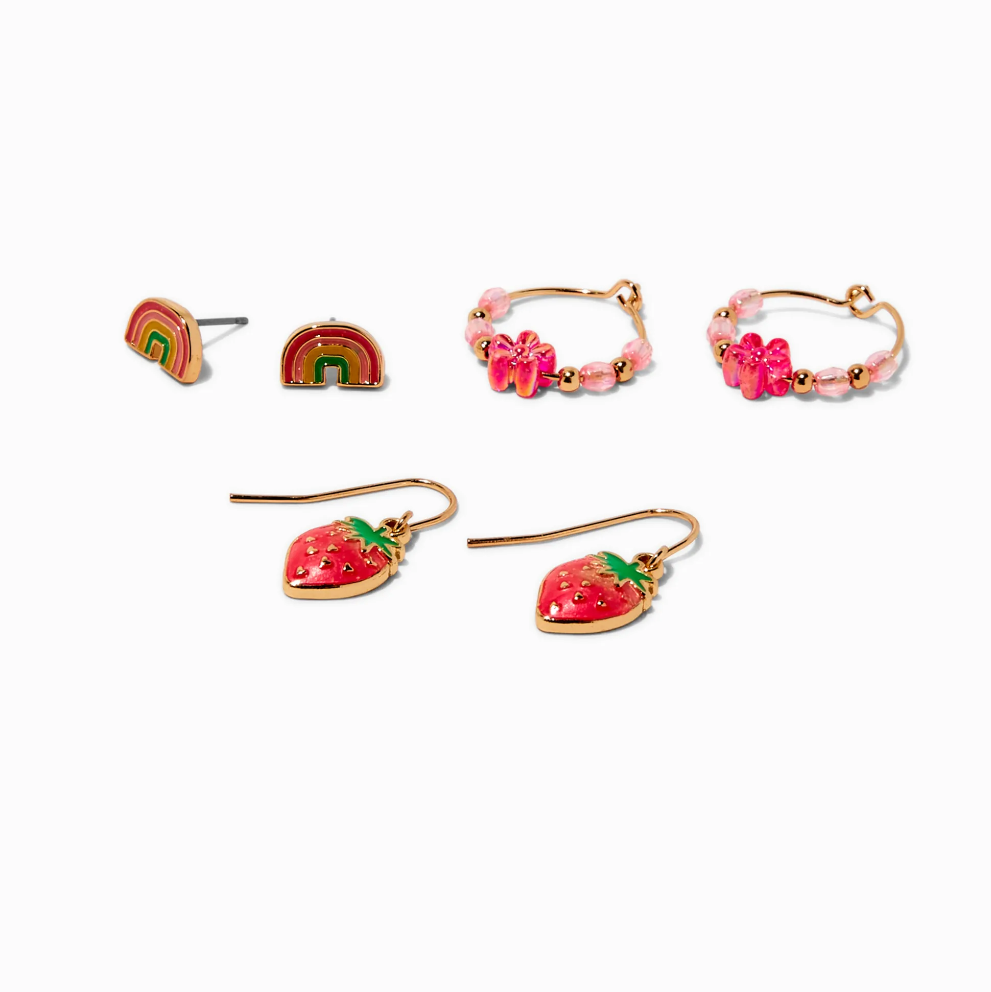Update your spring look with the perfect pair of earrings. This three-pack includes rainbow studs, floral hoops, and strawberry drop earrings.