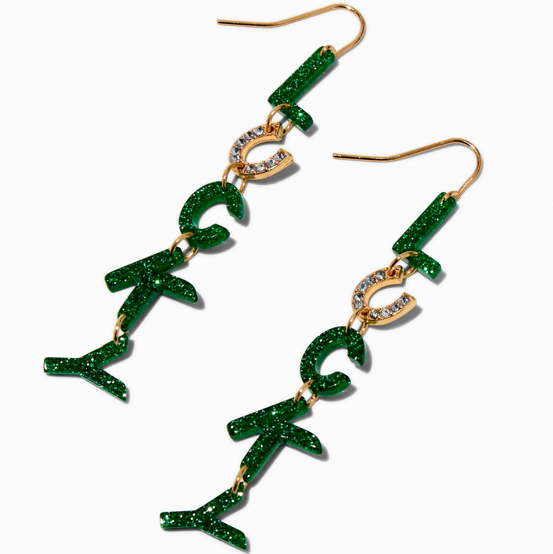 Dress for all the shenanigans in these drop earrings. The earrings say “Lucky” in a glittery fashion that will make you leap for joy.