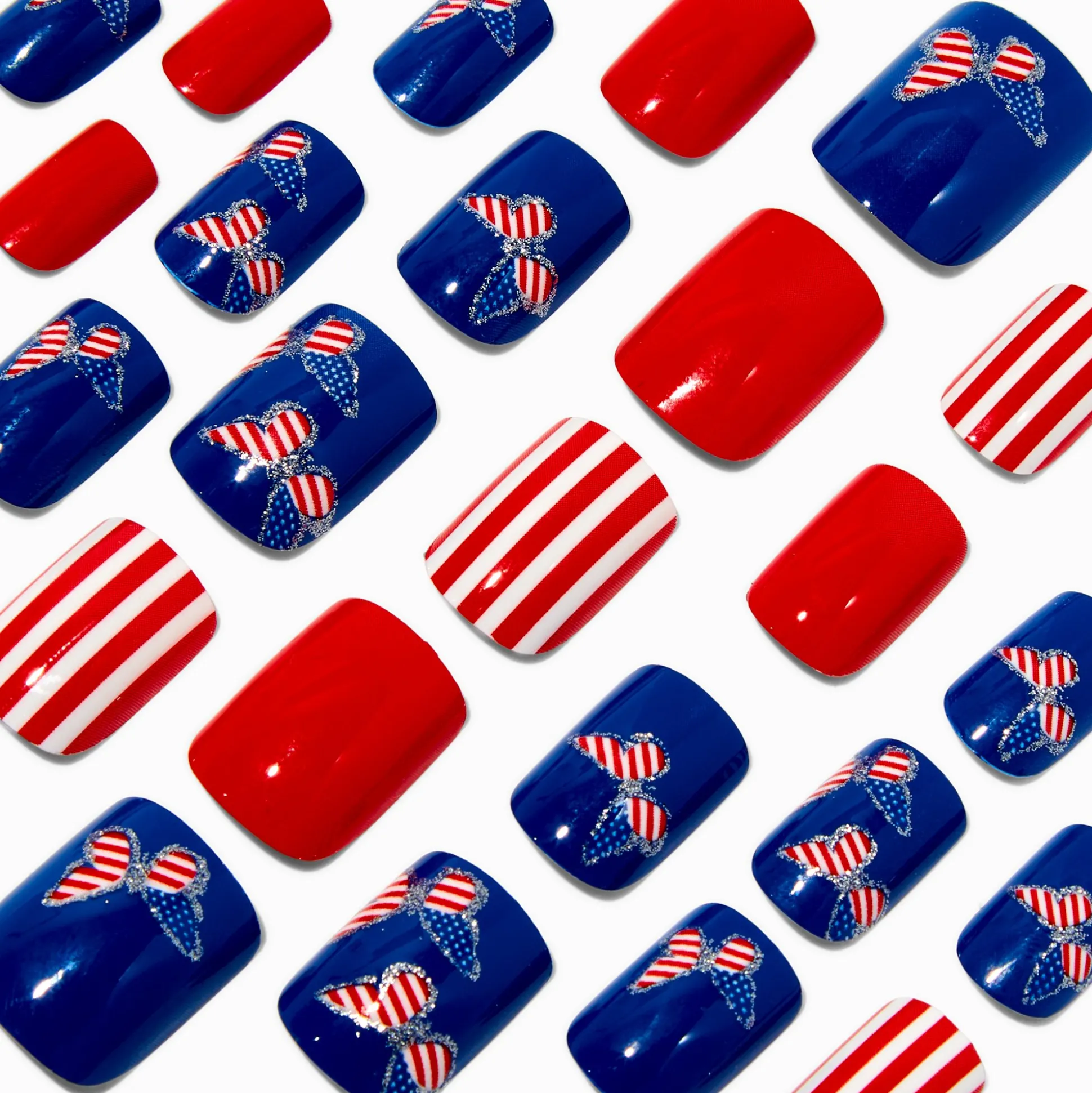 Serious patriotic vibes will be right at your fingertips with this on-trend set of faux nails. Square-shaped nail set features a red, white & blue butterfly design. Nails are easy to apply, just press on and go!