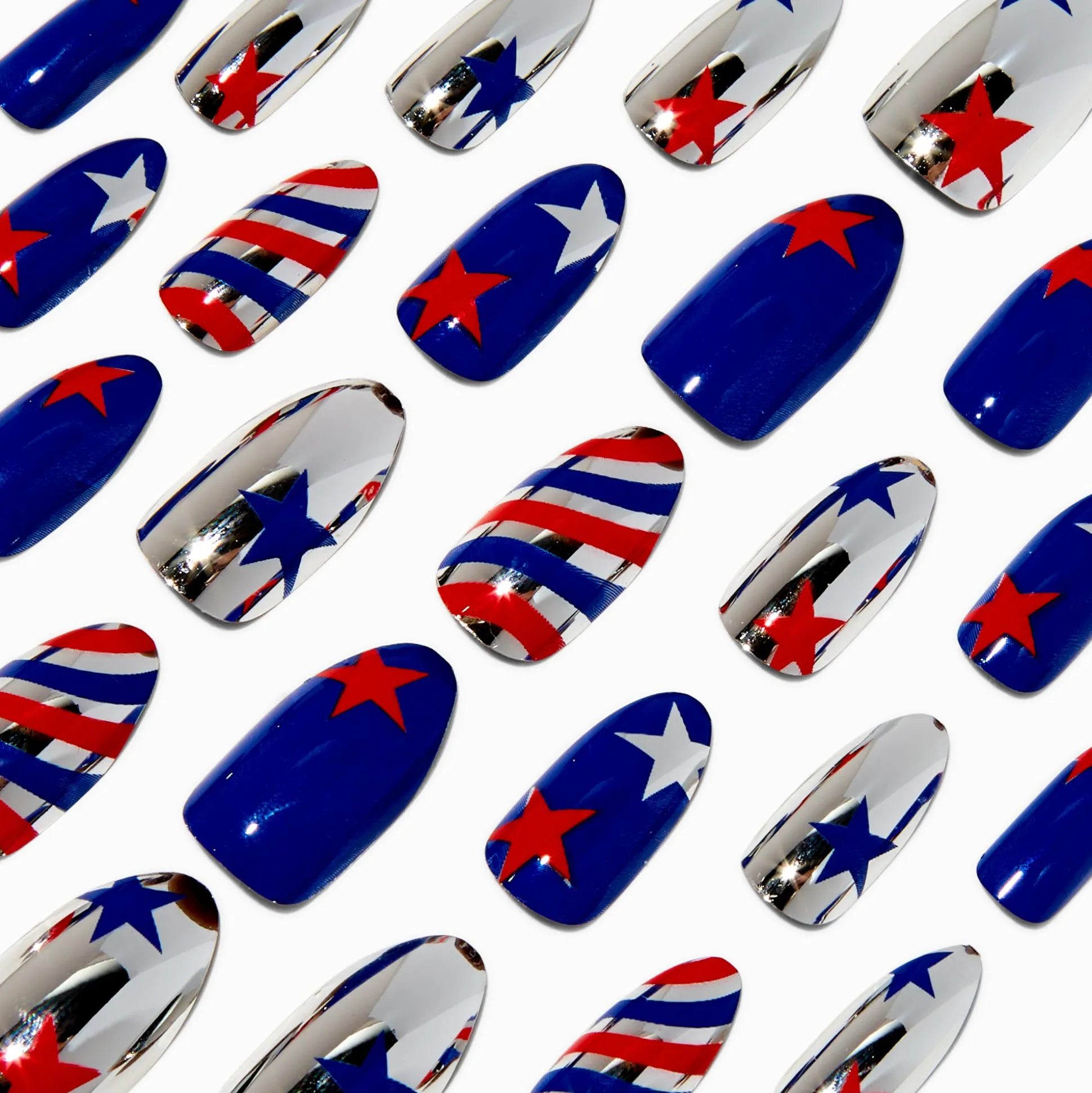 Serious patriotic vibes will be right at your fingertips with this on-trend set of faux nails. Stiletto-shaped nail set features a collection of stars & stripes designs. Nails are easy to apply, just press on and go!