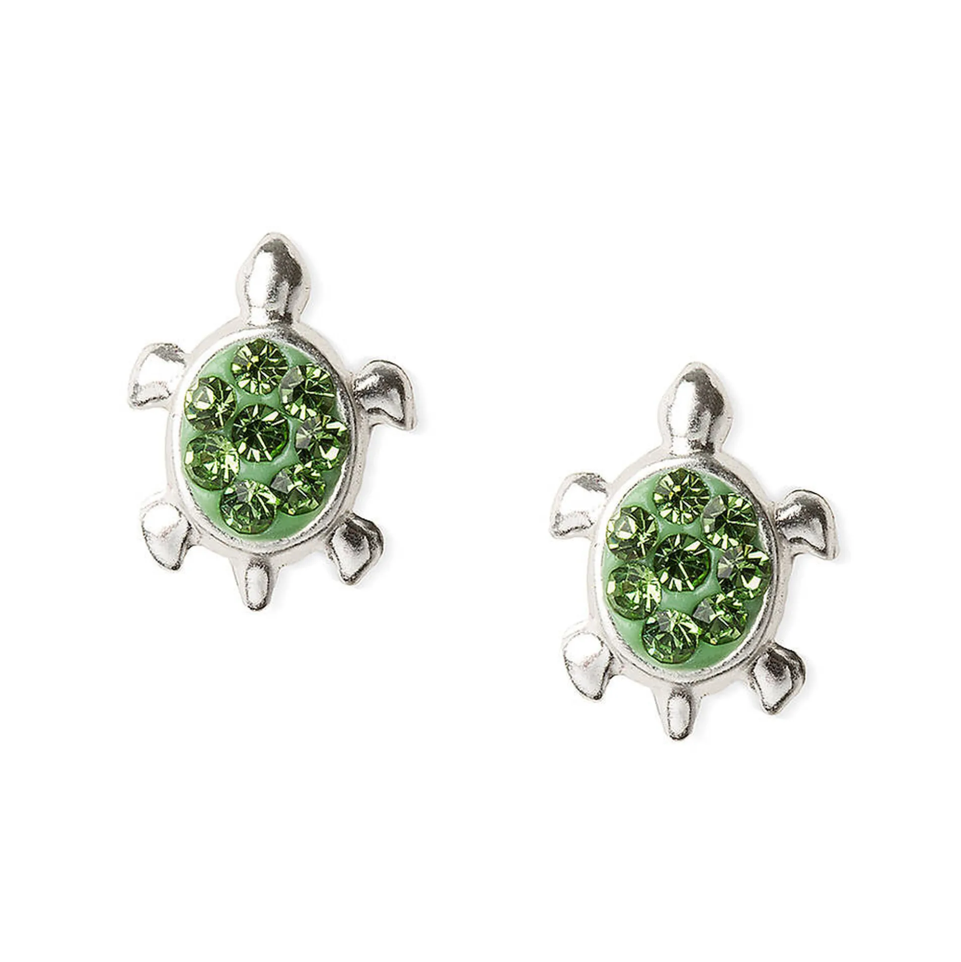 Look super adorable wearing these turtles on your ears! Sterling silver turtle stud earrings feature sparkly embellished shells accented with green stones.