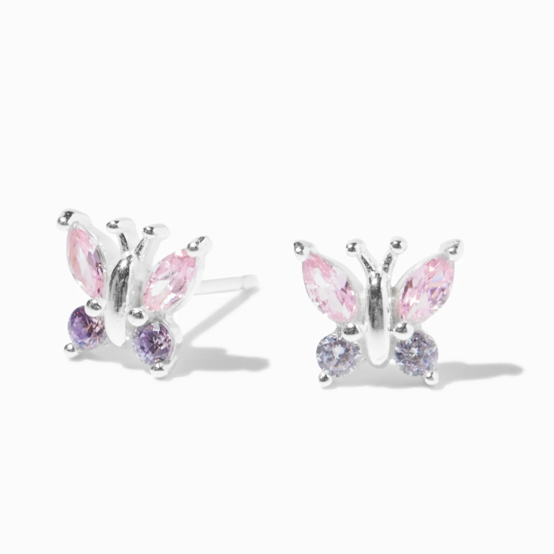 These stud earrings add a pop of purple & pink to your ears! The shiny sterling silver butterflies feature cubic zirconia wings.