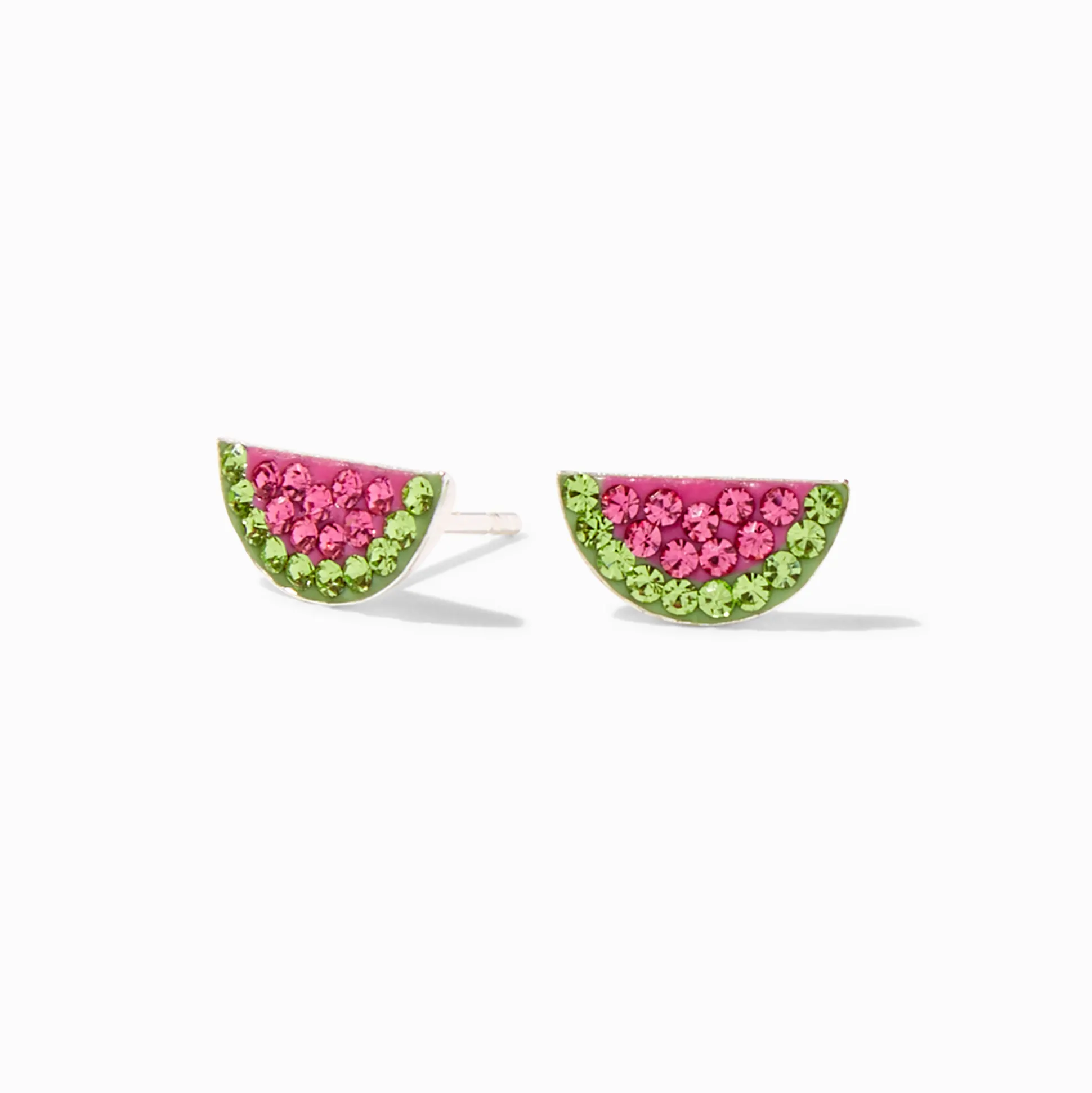 Carry a watermelon in style with these beauties on your ears. This pair of sterling silver studs are covered in simulated crystals that add sparkle to your watermelon look.