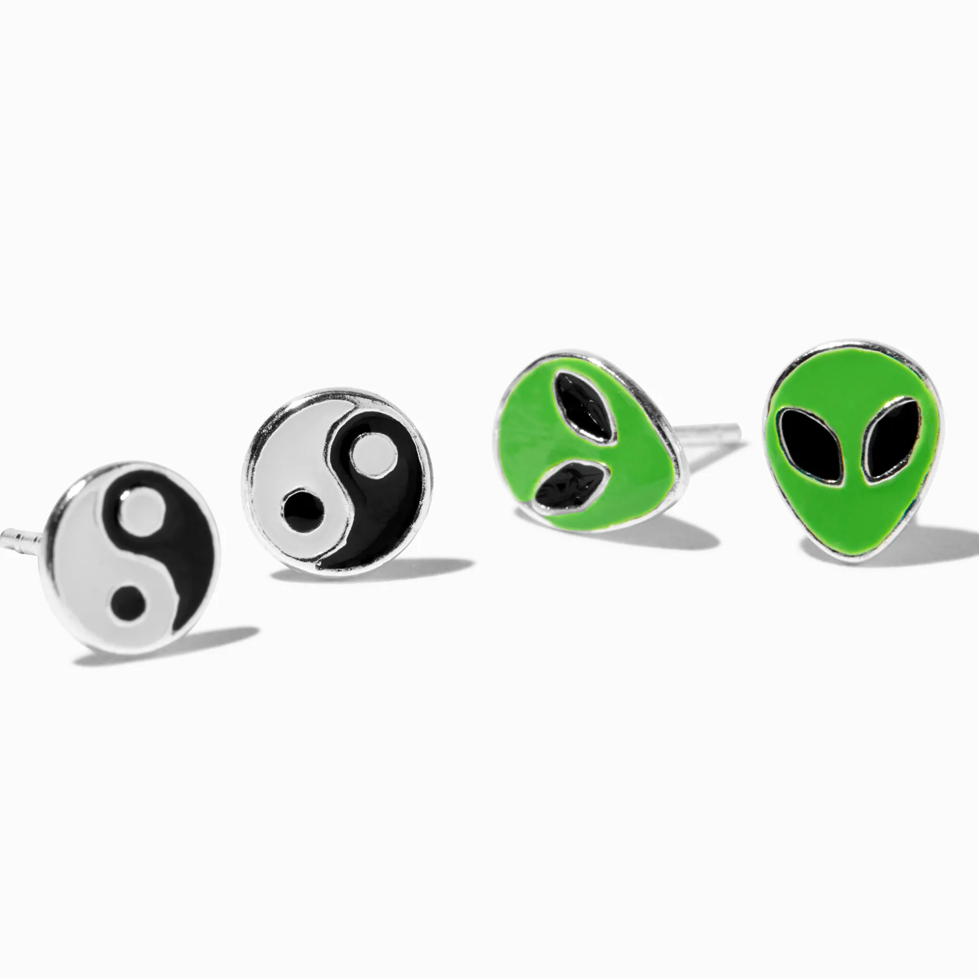 Send your look out of this world with this earring set. It includes sterling silver yin yangs and enamel alien studs.