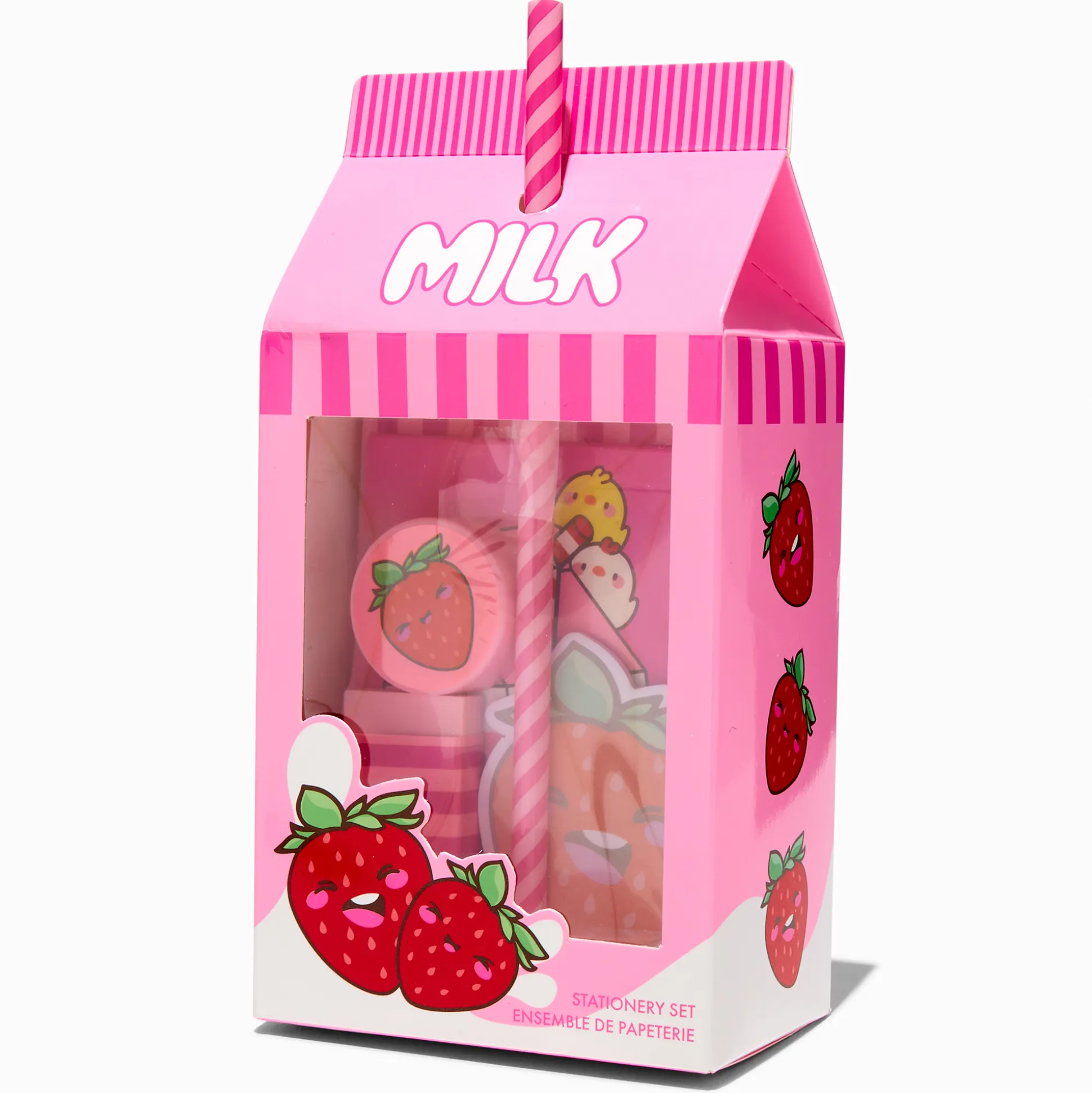 Decorated all over with strawberry milk designs, this stationery set has everything you need for school and home! You get a pen, eraser, sticky notes, pencil sharpener, notebook, and mini notepad for doing homework, making lists, drawing pictures, and recording all your thoughts.