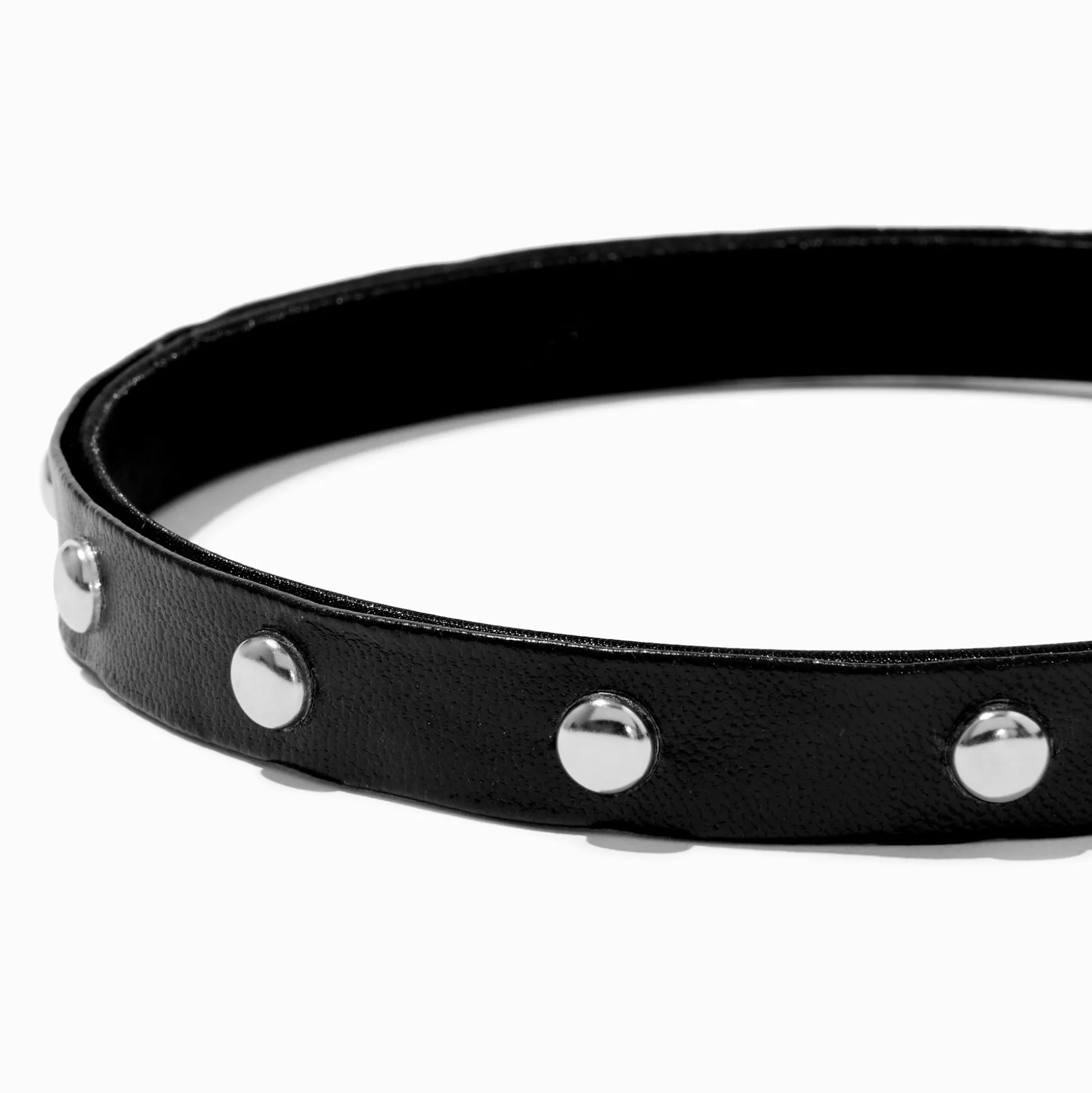 Keep your hair out of your face with faux leather cool with this headband. The black headband is studded and ready for you.
