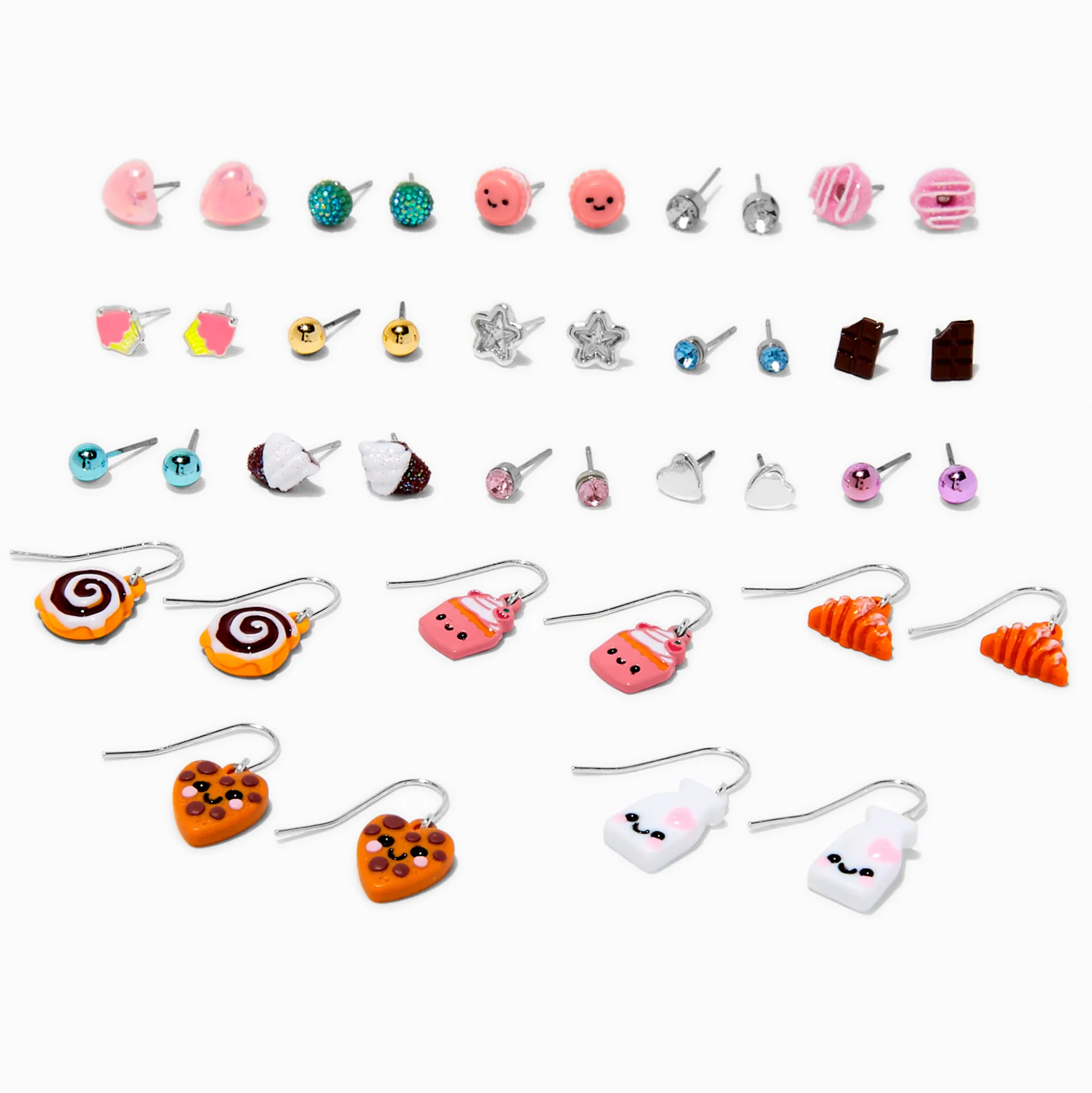 Stack these coordinating earrings and create your own super sweet earscape. Perfect for showing off your double or more piercings. The 20-pair set includes 15 studs and 5 drops. Designs include sweet treats like macaron, donuts, cupcakes, cinnamon rolls, cookies, and croissants. Other designs include milk, hearts, stars, balls, and more.