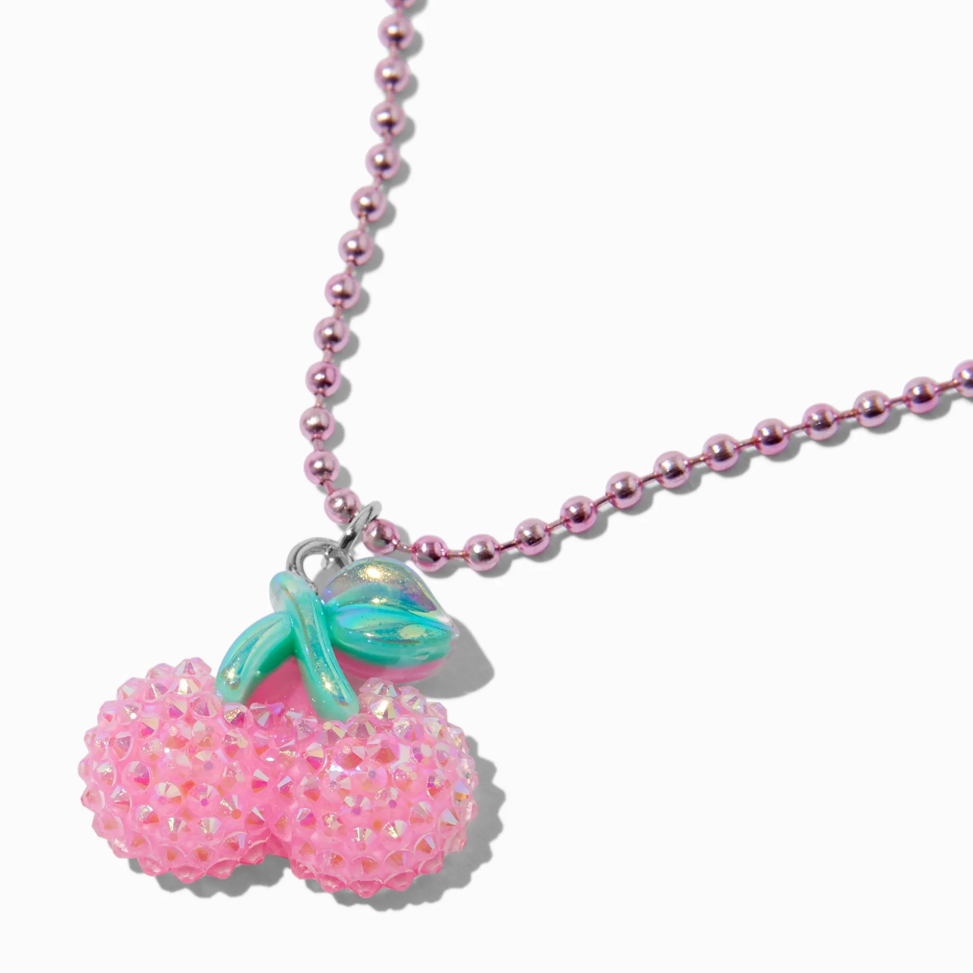 The beaded chain has a pink cherry pendant that is covered all over with texture & charm. This piece makes any outfit eclectic and fun.