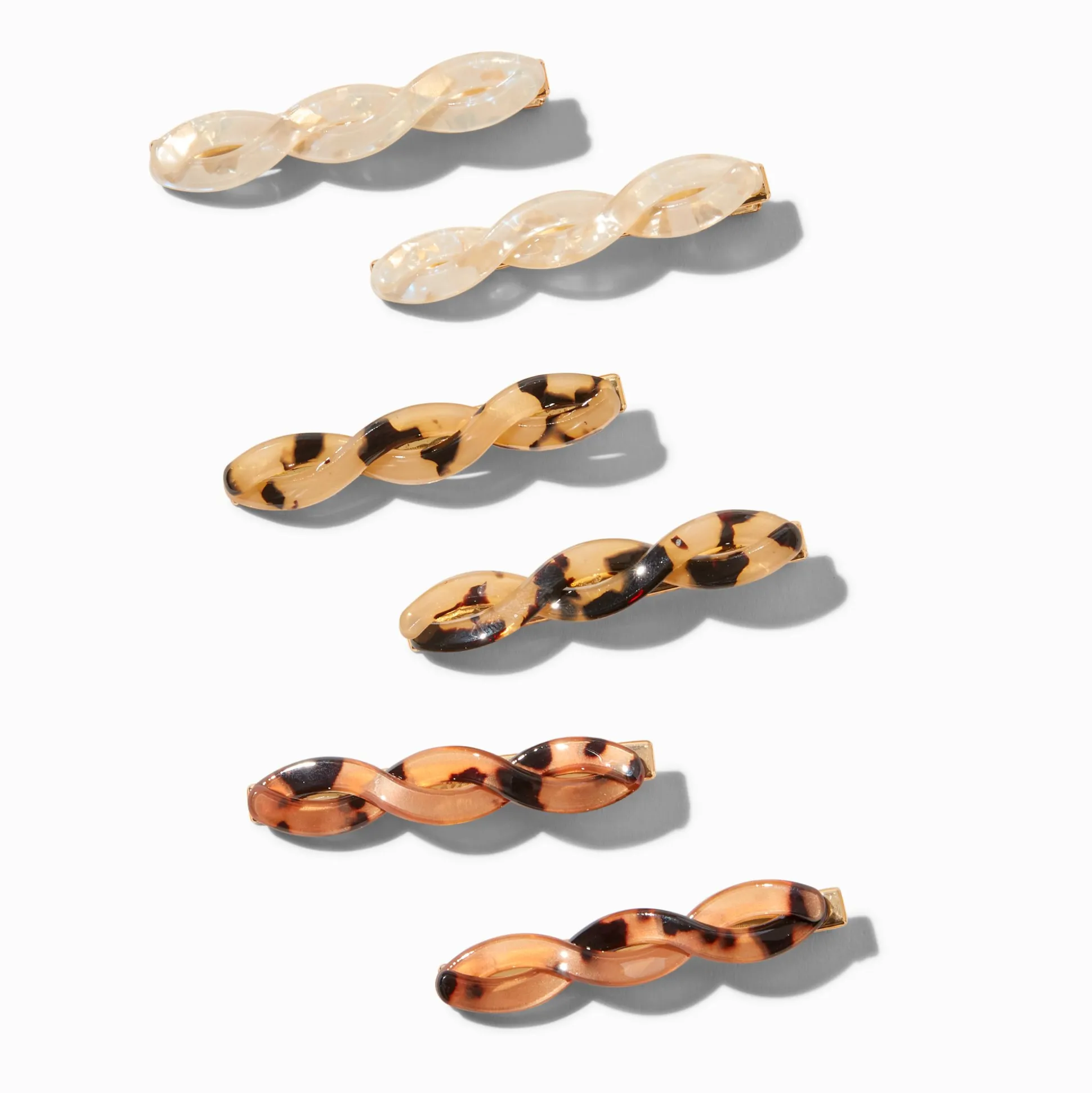 Add some tortoiseshell style to your drip with these twisted hair clips. The six pack includes three different shades.