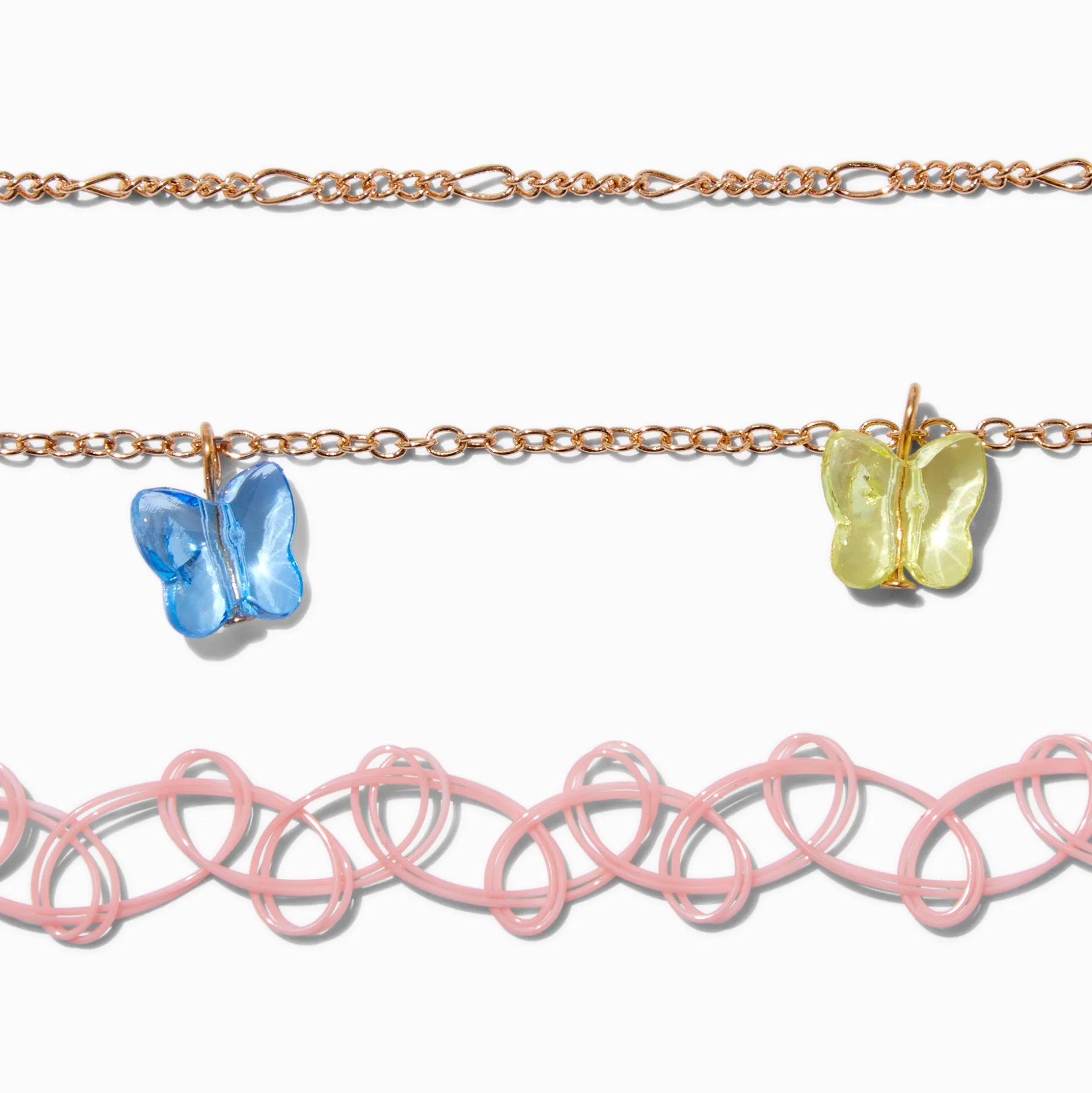 Give yourself options with this choker set. The three pack has a plain Figaro chain, a chain with puffy butterflies, and a pink tattoo-style chain.
