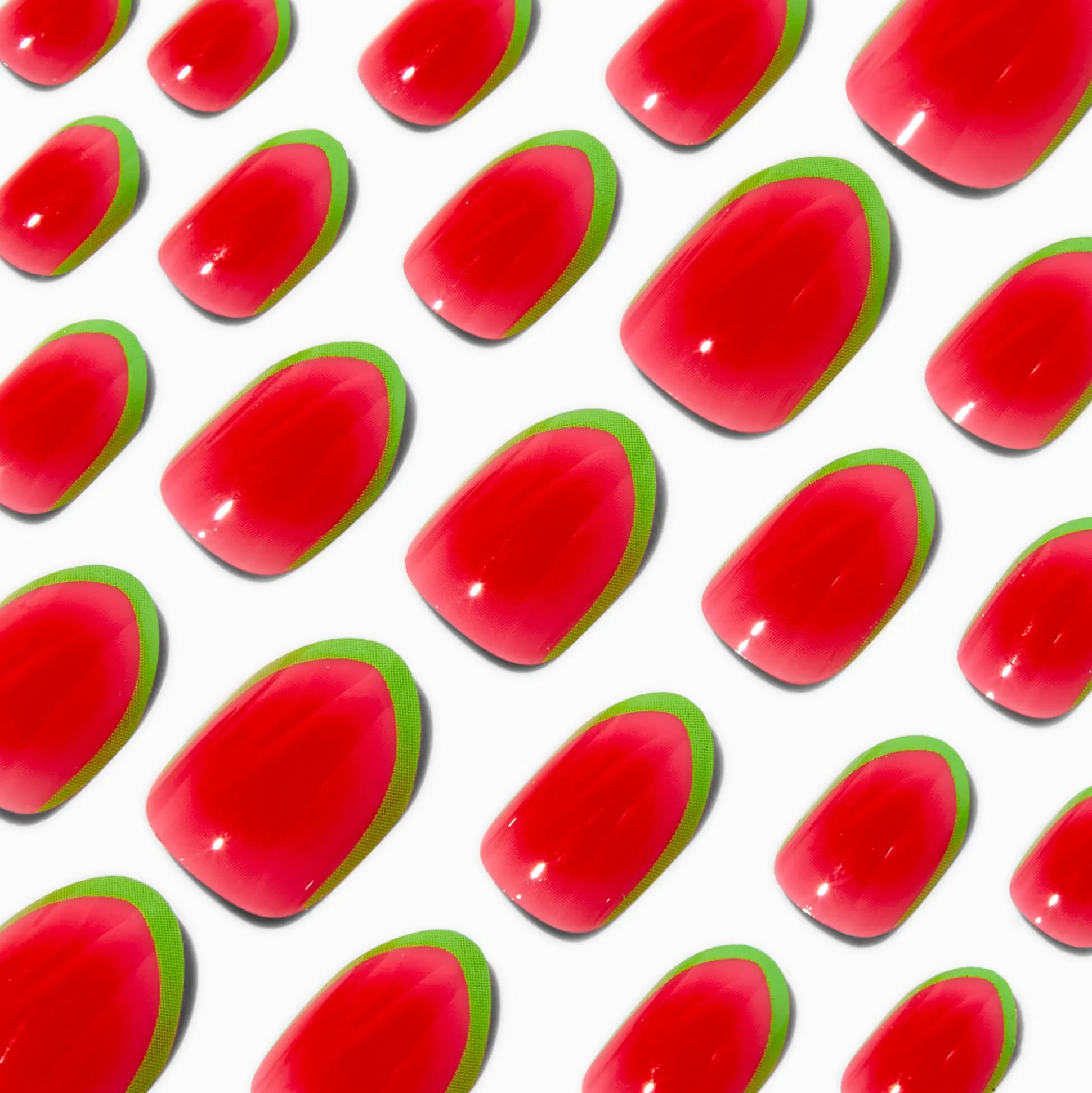 Serious summer vibes will be right at your fingertips with this on-trend set of faux nails. Stiletto-shaped nail set features French tips with summer watermelon-inspired designs. Vegan nails are easy to apply, just press on and go!