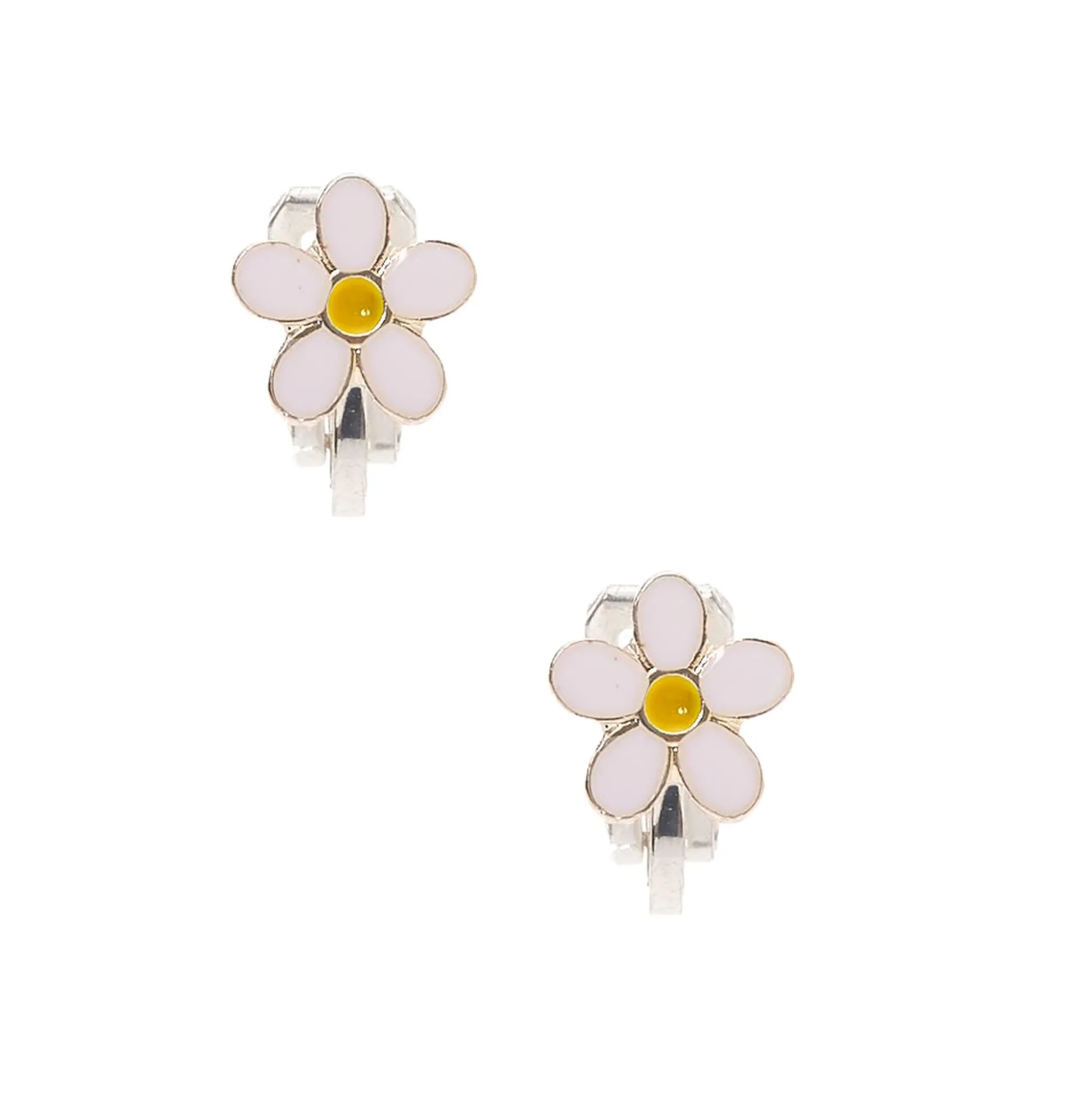 These adorable daisy clip-on stud earrings feature enamel petals and vibrant yellow centers. Perfect for springtime, no piercing necessary!