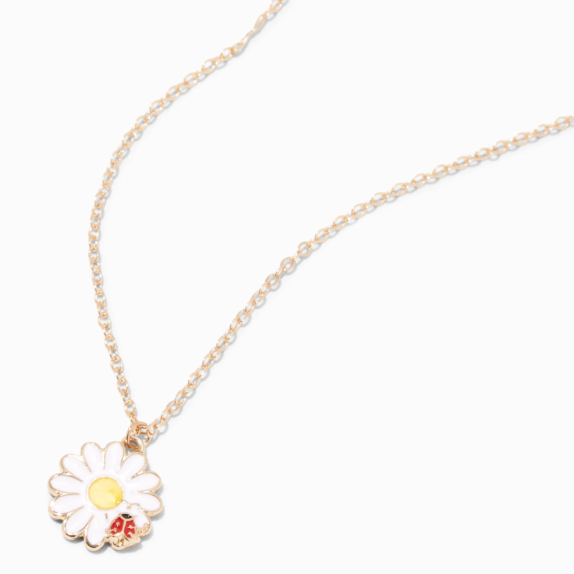 Show off your love for nature with this pendant necklace. The gold-tone chain has a white enamel daisy design that’s decorated with a delightful ladybug.
