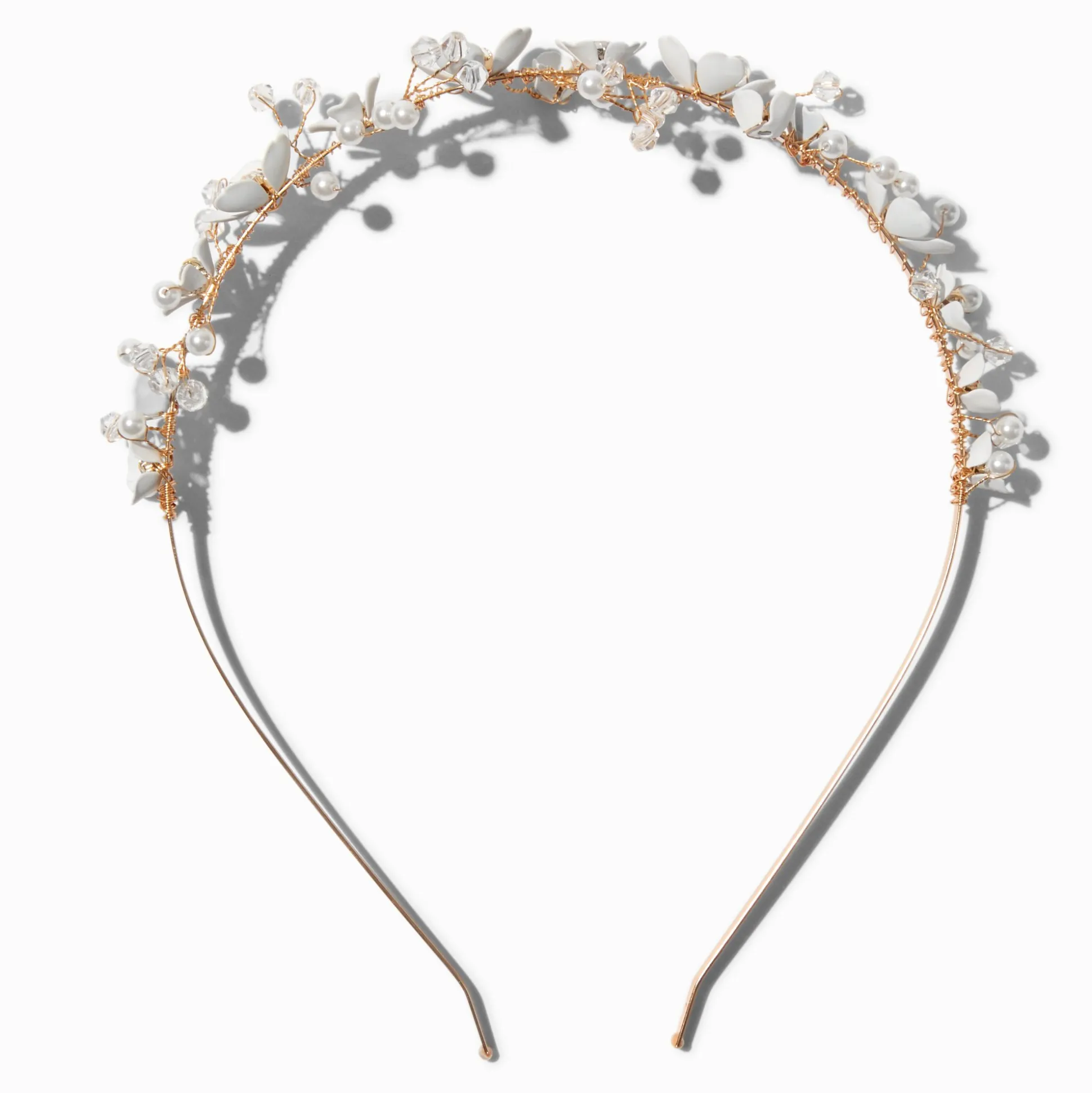 White flowers are attached to a gold-tone metal headband, and the assortment has faux pearls bit of charm.