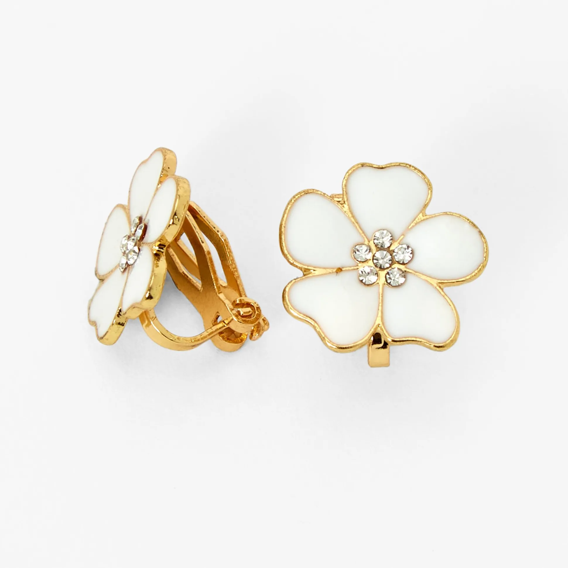Discover the power of a flower with no piercing required with these pretty clip on gold-tone earrings. Bright white flowers are accented with faux crystal centers for a welcome bit of sparkle.