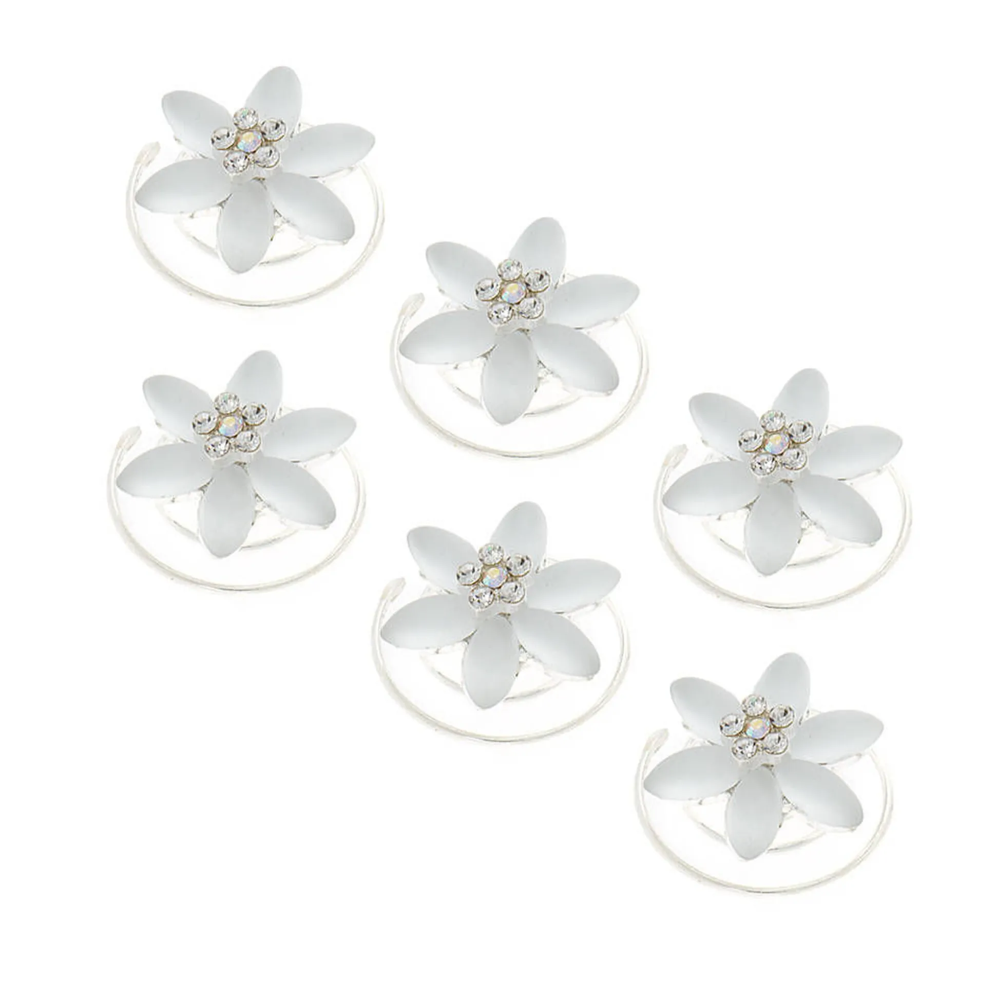 Add pretty floral sparkle and shine to hair with these hair spinners. Each hair spinner features a flower with frosted petals surrounding a glass rhinestone center.