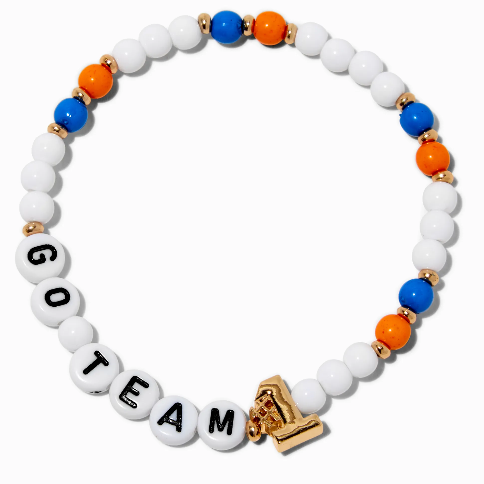 Cheer on your team with this stretch bracelet on our wrist. The white beaded bracelet has “Go Team” spelled out in alphabet beads and is finished with a gold-tone #1 charm.