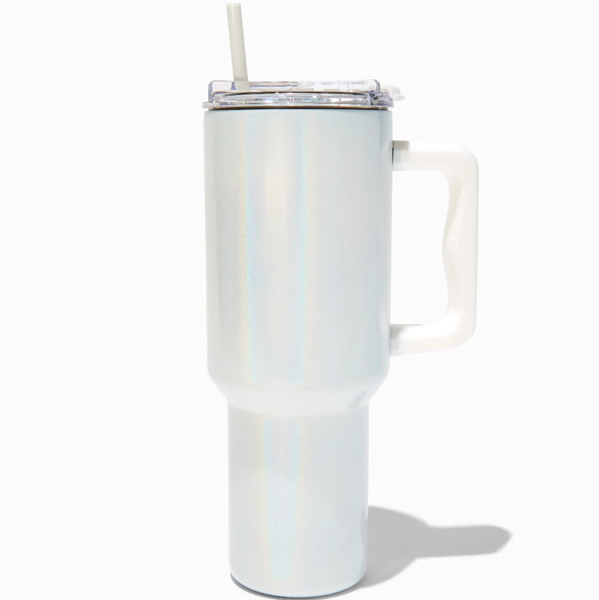 A cool tumbler will inspire you try and stay hydrated throughout the day! This one has white holographic finish. There’s also a matching straw, a convenient handle, and a lid with a hole for a straw and a lidded spout. The bottom is tapered so it fits into standard car cup holders.