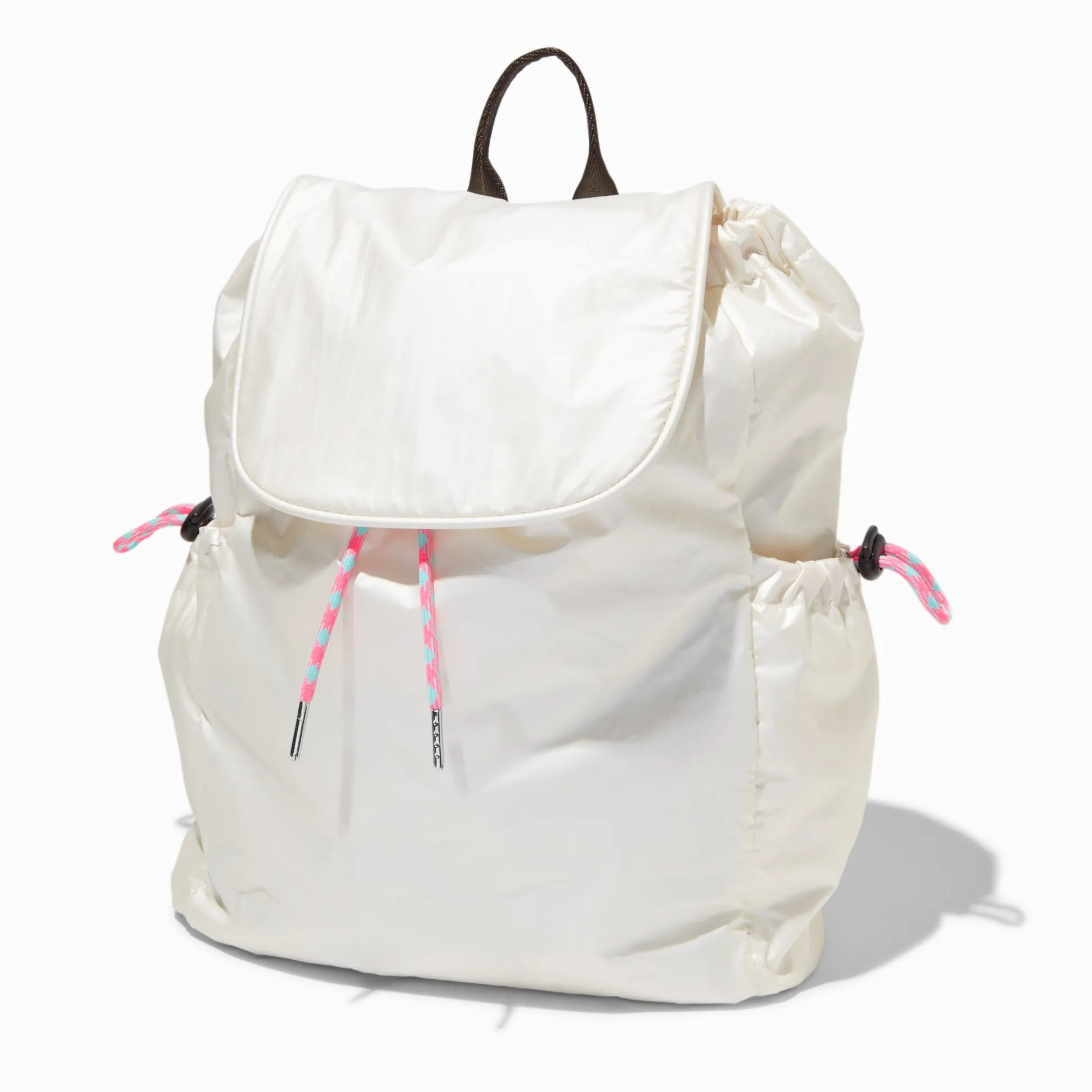 Store and carry your everyday essentials in style! This flap backpack includes one major compartment to fit all your school or gym necessities. Handy top handle plus back straps that adjust for a comfortable fit.