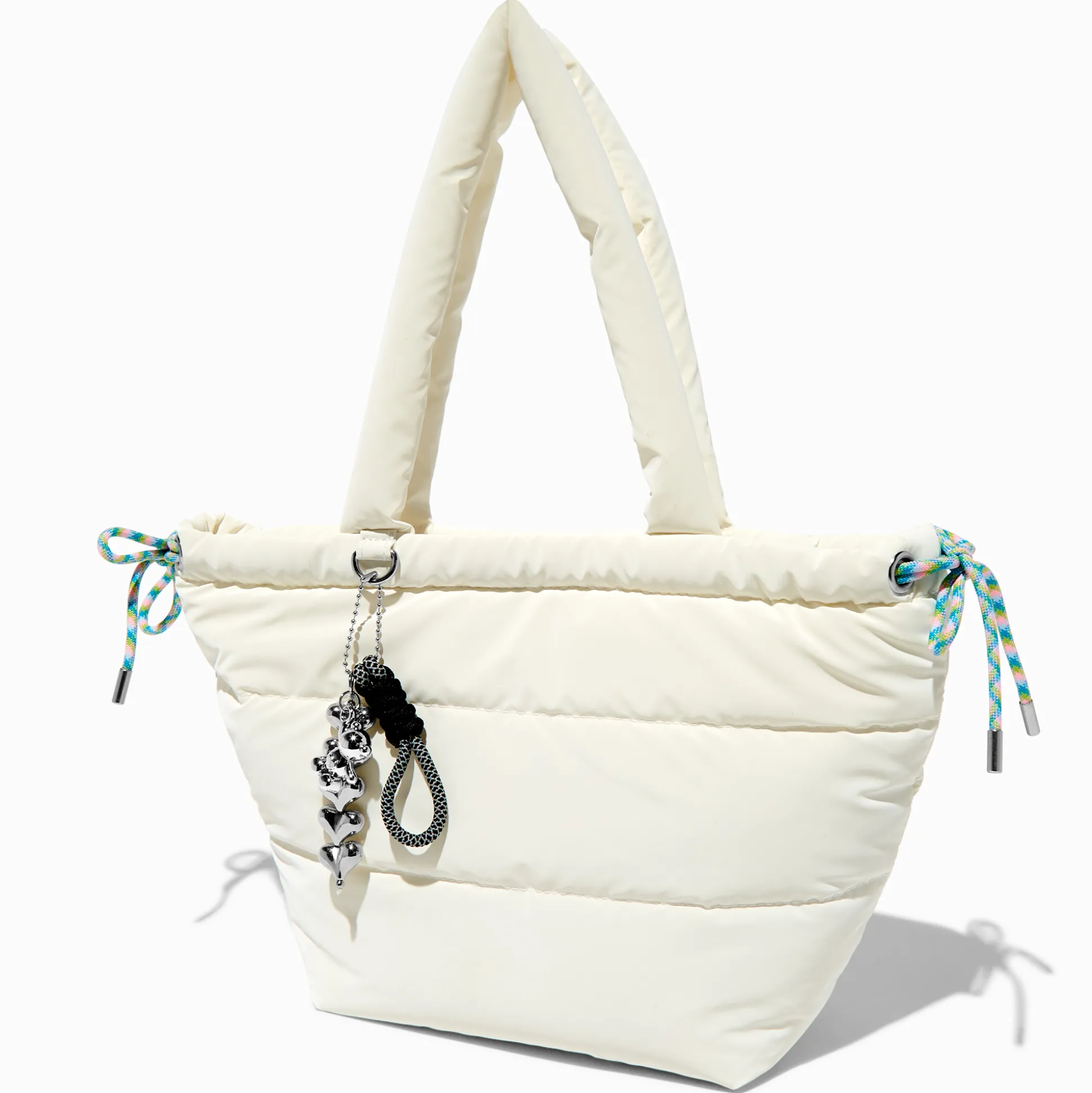 There is so much to love about this tote bag. The puffy and white exterior has an easy zipper closure to keep your valuables secure. It even comes with cute bag charms to spice up your ‘fit. With plenty of room for your phone, keys, makeup, and more, this bag is meant for going places.