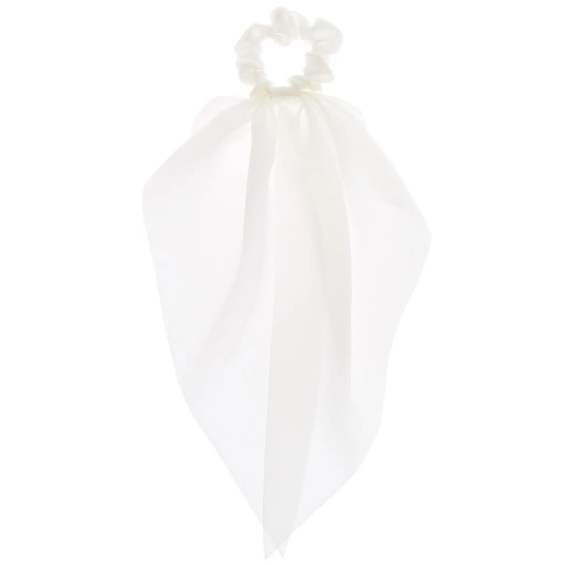 Drape your ponytail in classic white! Get the look of a pretty long scarf attached to a hair scrunchie. Perfect for adding extra flair to any outfit.