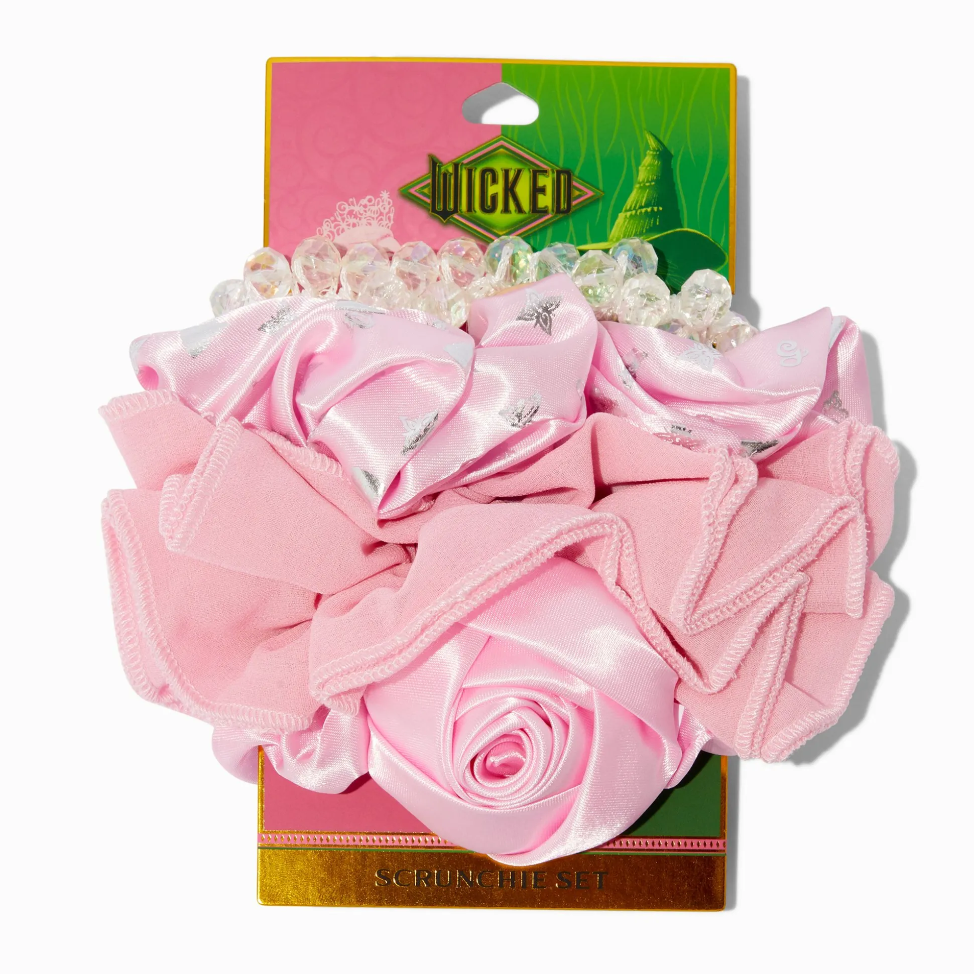 Upgrade your hair flair with this Oz-inspired set in this Wicked™ scrunchy set. The velvety options include shades of pink with movie-inspired designs.