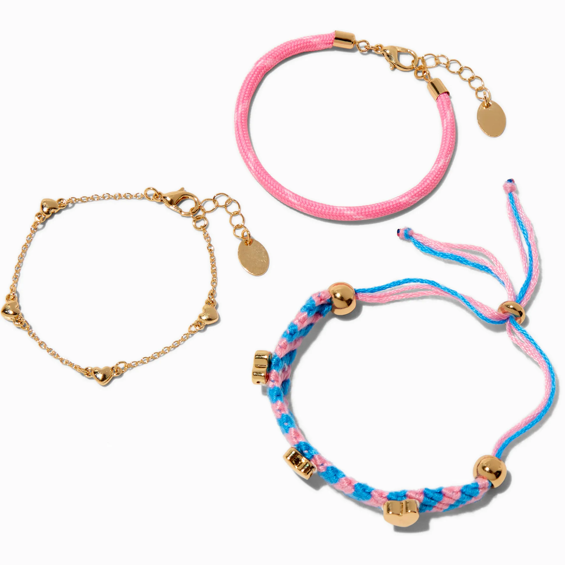 Stack up on style with this mixed bracelet set. It includes two chain bracelets and one adjustable bracelet with woven with hearts, pink rope, and a heart chain.