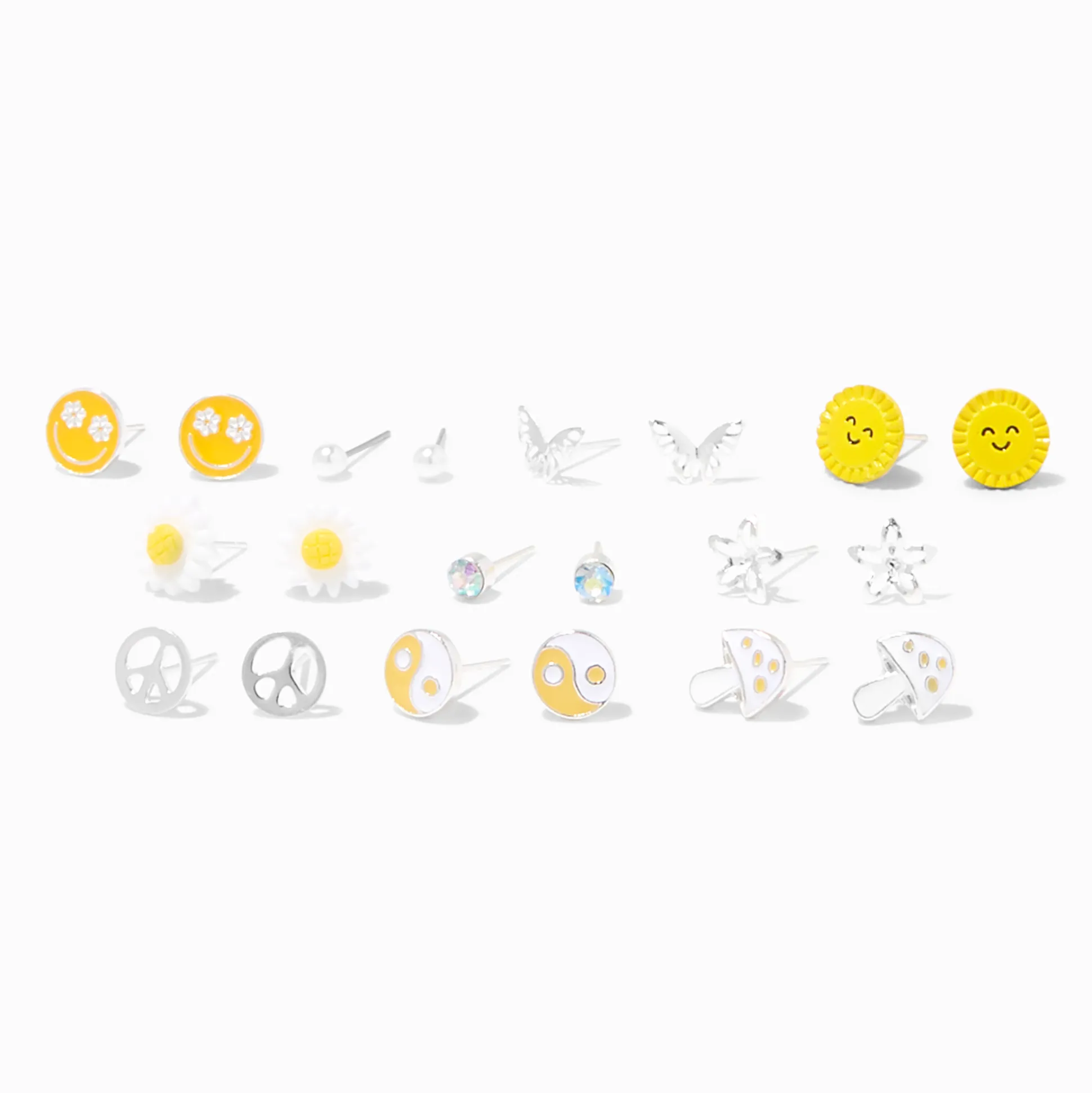 Soak up the sun with this happy earring set. Options include daisy-eye happy face, faux pearls, butterflies, happy face suns, daisies, faux crystals, daisy outlines, peace signs, yin yangs, and yellow mushrooms.